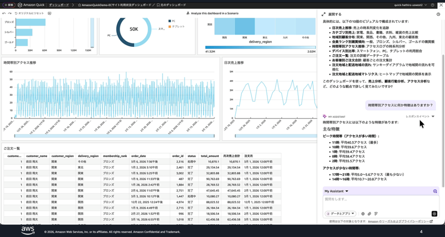AWS Japan 技術支援本部 テクニカルアカウントマネージャー の服部 洋明 は、EC サイトを題材にした 3 つのデモを通じて、チャットエージェントの活用を実演しました。デモ 1 の売り上げ分析では、ダッシュボードの概要把握から時間帯別・日次の特徴分析、さらに分析手法の提案まで、チャットエージェントとの対話で段階的に深掘りしていく様子を示しました。Amazon Quick リサーチを用いて本格的な分析レポートを自動生成する流れも紹介しました。