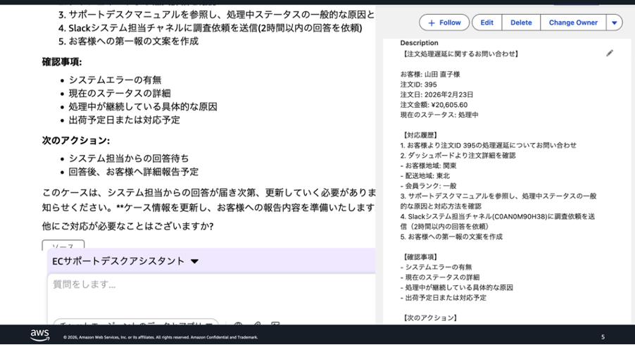デモ 2 のサポートデスク対応では、カスタムエージェントを使い、注文ステータスの確認からマニュアル参照、Slack への通知、顧客への一報作成、Salesforce へのケース登録までを Amazon Quick の中で一気通貫で完結する内容を紹介しました。