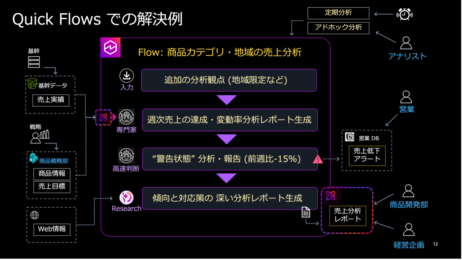 Flows のデモでは、商品の売り上げ分析を題材に、Amazon S3 や SharePoint 上の散在データを専門エージェントが横断的に活用し、週次売り上げの分析からリスク判定、Notion への自動アラート通知、Amazon Quick リサーチによる深い分析レポート生成までを、ノーコードで一つのフローとして構成する様子を示しました。