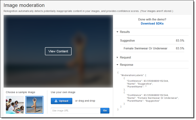 AWS Management Consoleではこの機能を実験するための画像節度デモを使うことができます: