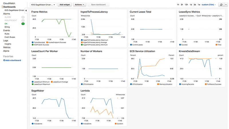 ライブラリソフトウェアは、デフォルトでさまざまな CloudWatch メトリックを提供しており、顧客は個々のストリームを処理するための進捗状況をモニタリングすることができます。これには、クラスタ内のワーカーのリソース消費量、Amazon SageMaker エンドポイントの呼び出し速度、および推論結果がどのようにして Kinesis Data Stream に公開されるかについて決定するメトリックが含まれます。CloudFormation テンプレートは、すぐに使用が可能な CloudWatch ダッシュボードを作成し、顧客は目的に合わせてさらに拡張することが可能です。デフォルトでは、ダッシュボードは、ソソフトウェアのレイテンシ、信頼性、およびスケーリング特性に特有の KIT およびカスタムメトリックを強化するような基本サービスの主要メトリックをキャプチャします。
