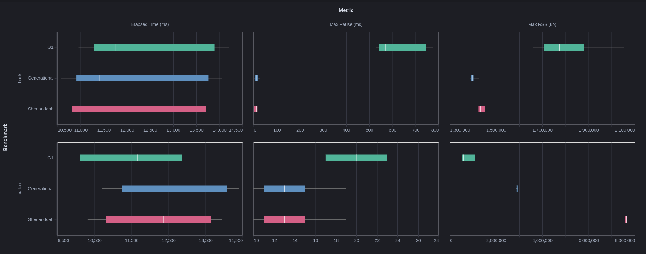 下の画像では、測定分布を「箱ひげ図」のテーブルを示しています。「ひげ」は p5 と p95 の値で、「ボックス」のエッジは p25 と p75 の値です。真ん中の線は p50 です。各行は Dacapo suite の異なるベンチマークです。各列はベンチマークの指標です。小さい値の方が良い値です。「 Elapsed Time 」列は、経過時間のベンチマークです。こちらも、小さいほど良い値です。「 Max Pause 」 は、 jHiccup ツールで測定された、観測された最大一時停止時間です。「 Max RSS 」列は、ベンチマーク実行中にプロセスで観測された Resident Set Size ( RSS ) の最大値です。