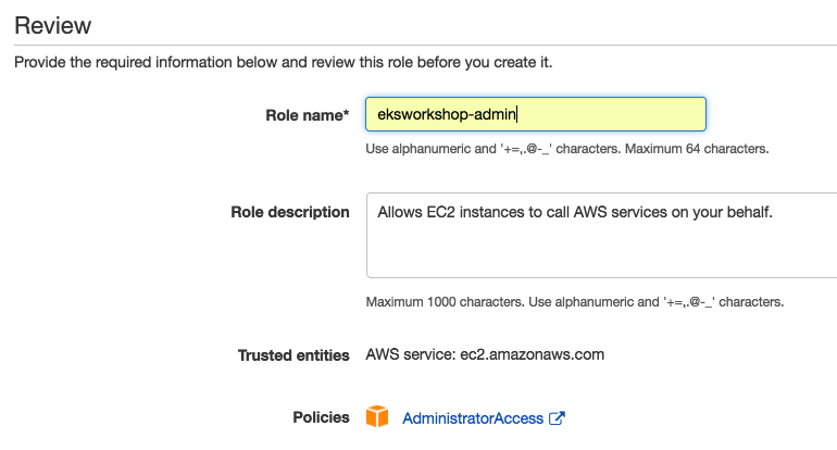- 名前に [eksworkshop-admin] と入力し、[ロールを作成] をクリックします。