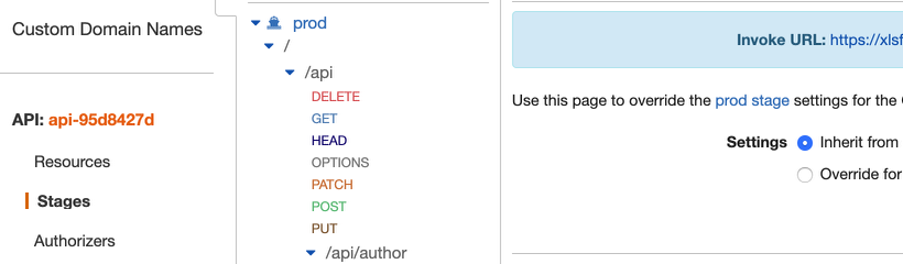 左側にあるメニューのステージリンクをクリックすると、prod ステージが表示されます。/api/author をクリックしてから、メソッド取得をクリックします。API の呼び出し URL が表示されたら、コピーします。