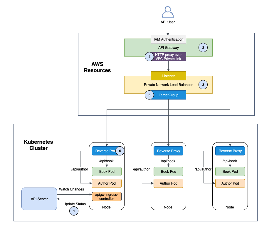 - API Gateway Ingress Controller は、API サーバーからの Ingress イベントを監視します。要件を満たす Ingress リソースを見つけると、AWS リソースの作成を開始します。