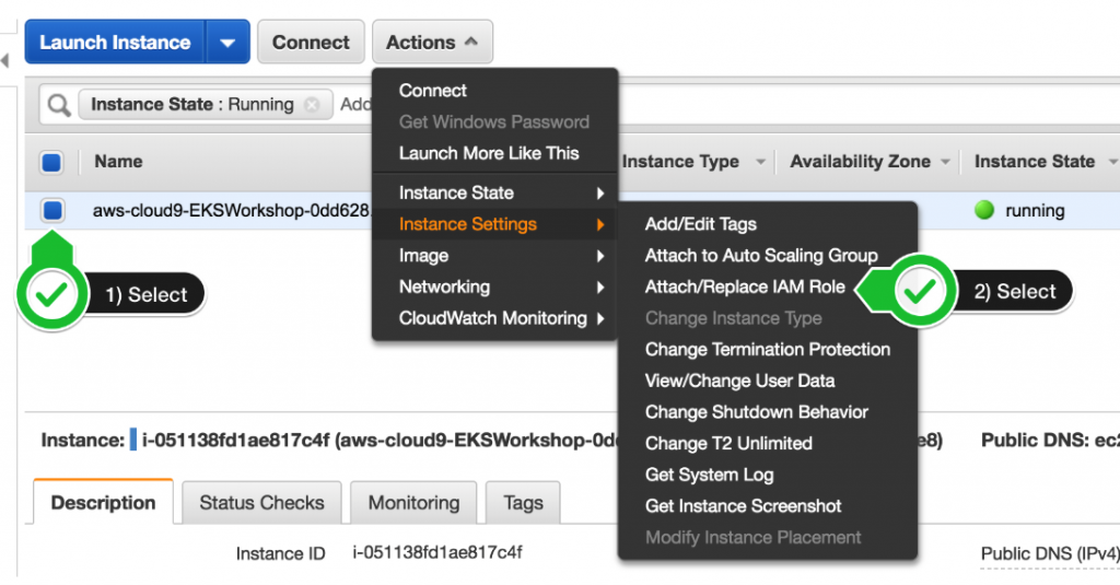 - インスタンスを選択し、[アクション] / [インスタンス設定] / [IAM ロールをアタッチ/置換] を選択します