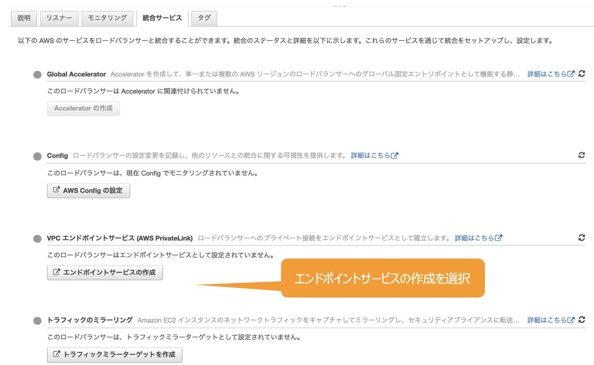 3.「エンドポイント サービスの作成」をクリックし、手順に従ってNLB用のエンドポイントサービスを設定します。詳細については、ドキュメントをご覧ください。