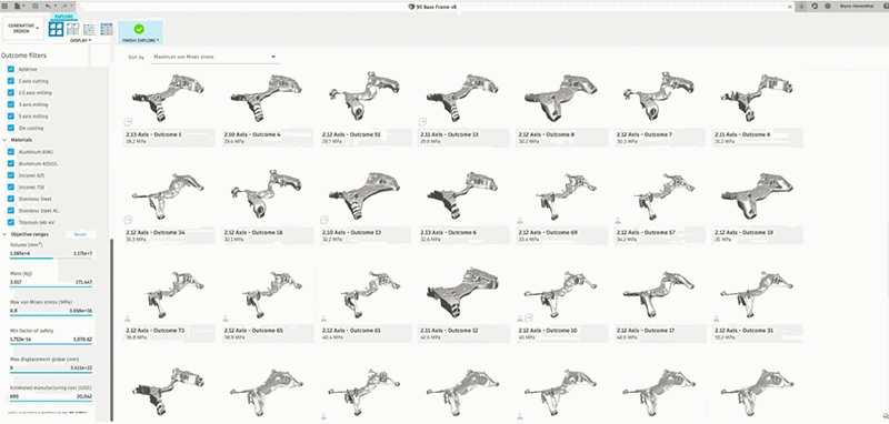 トレーニングされた視覚的類似性検索モデルは、特徴ベクトルを計算します。特徴ベクトルは、距離でグループ化したり、最近傍のジェネレーティブデザインの結果を見つけたりするために使用できます。同じ様なジェネレーティブデザインは、同様の特徴ベクトルを生み出します。視覚的類似性検索は、ジェネレーティブデザインからのデザイン結果のカテゴリ別ビューを提供するため、最適なデザインを選択できます。次のスクリーンショットは、視覚的類似性検索モデルを使用した Fusion 360 の例を示しています。