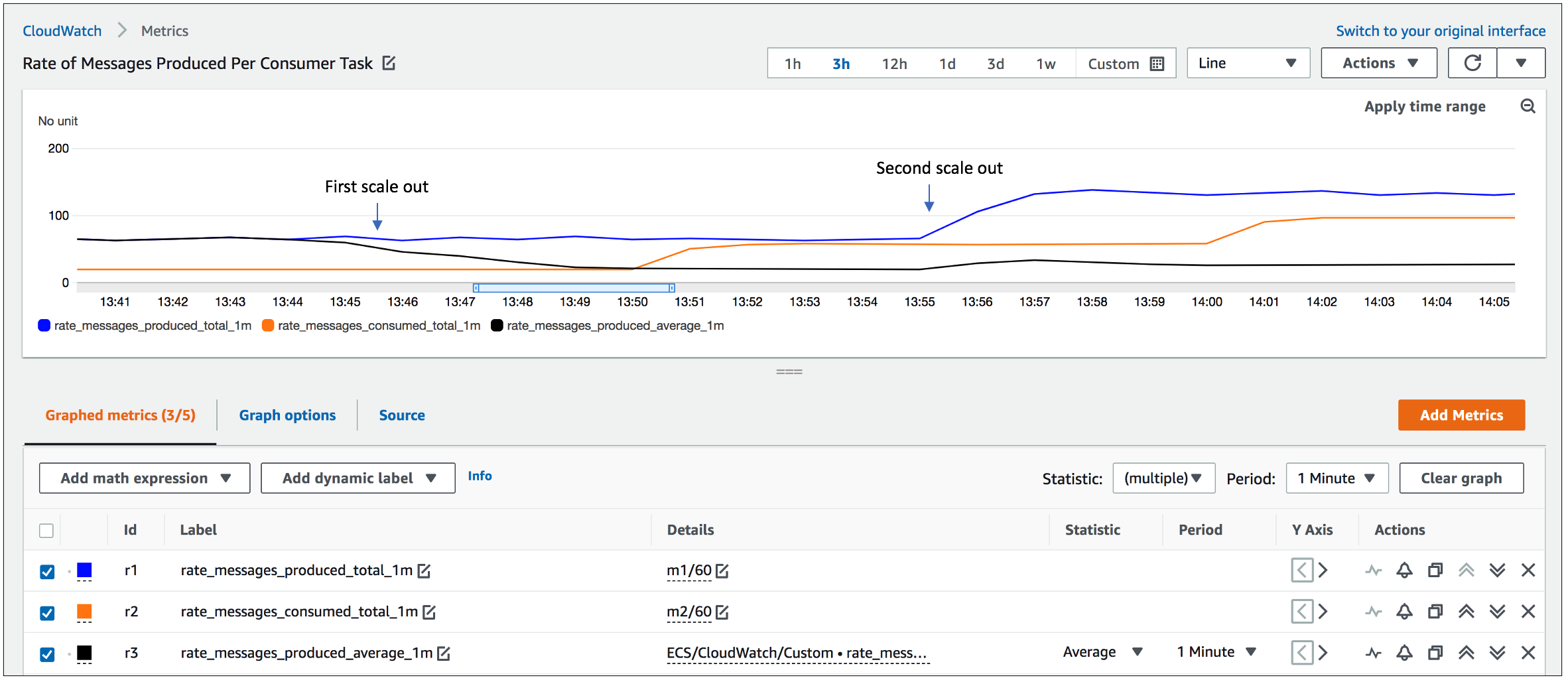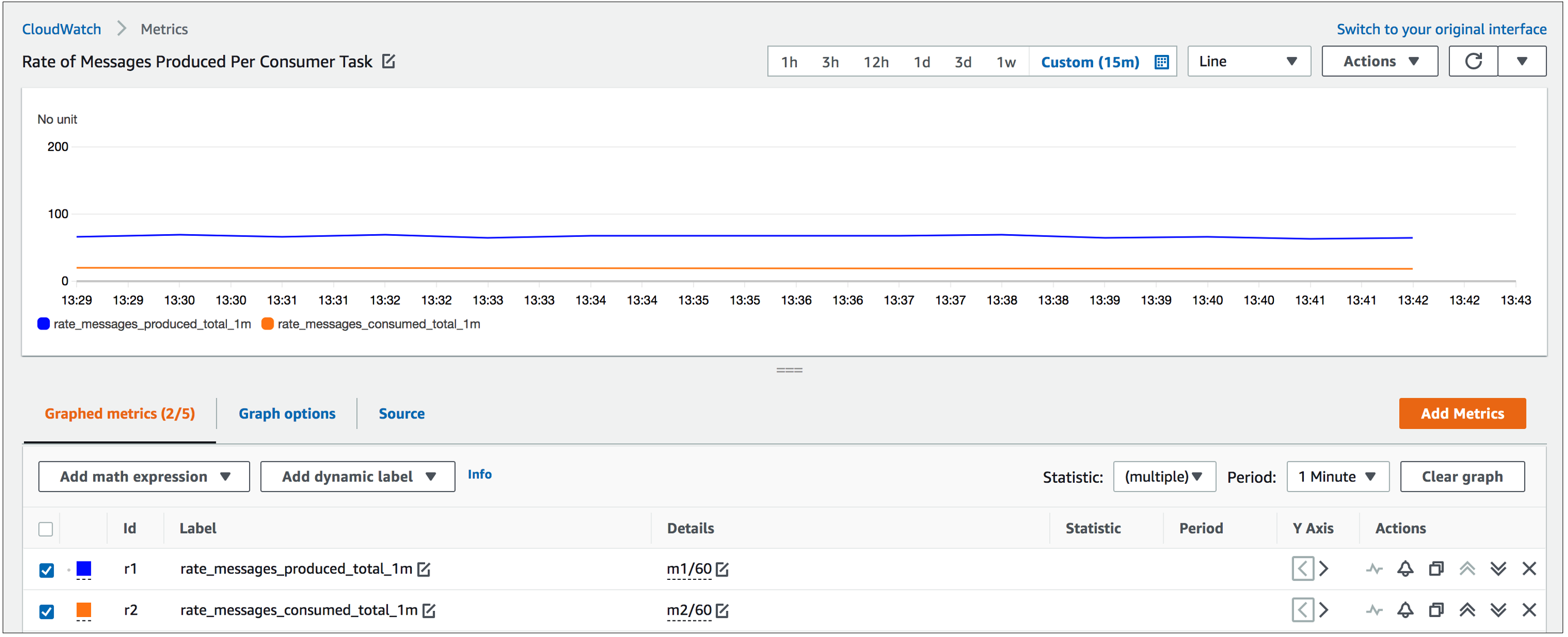 図 2. Metric Math の数式を使用して表示された生成/消費されたメッセージの初期のレート