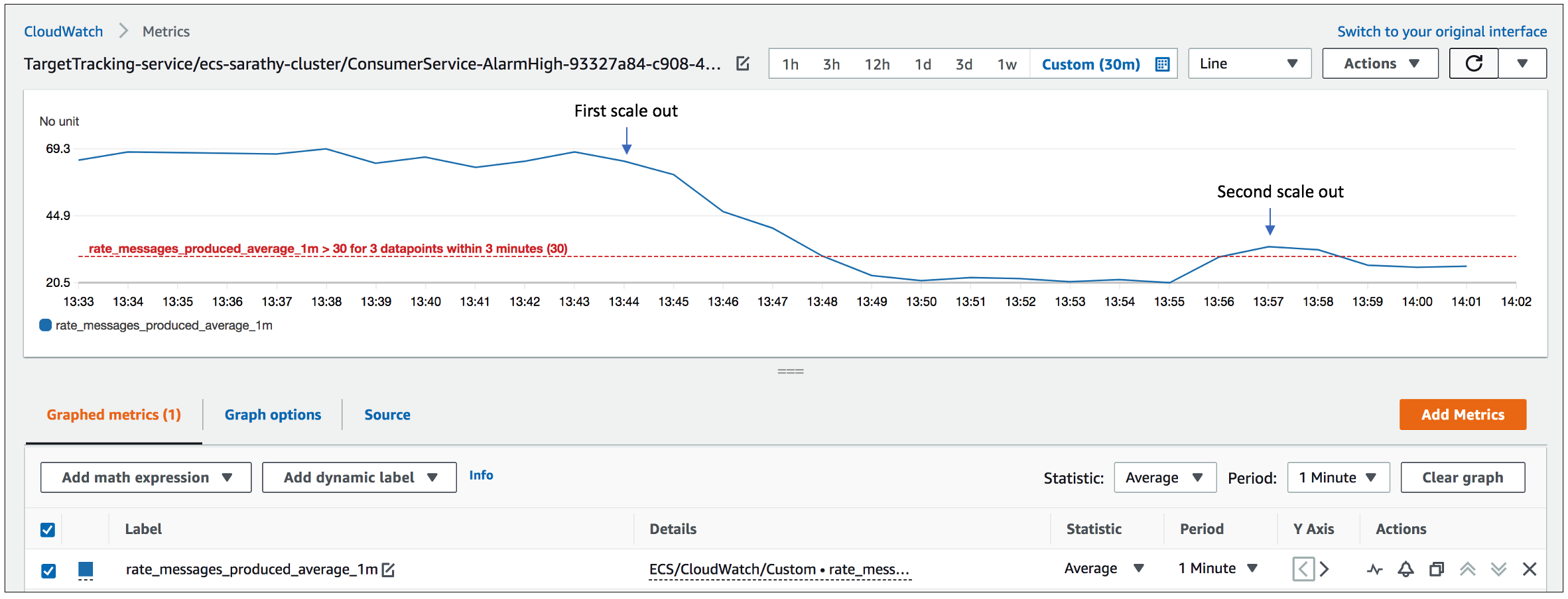 ターゲット追跡スケーリングポリシーを作成すると、Application Auto Scaling は、下図に示す 2 つのメトリクスアラームを作成し、コンシューマータスクのオートスケーリングを管理します。この 2 つのメトリクスアラームは、1 つはスケールアウトを処理し、もう 1 つはスケールインを処理するもので、これらを併用することで、使用率メトリクス rate_messages_produced_average_1m の平均値が 27 ~ 30 の範囲に収まるようにします。