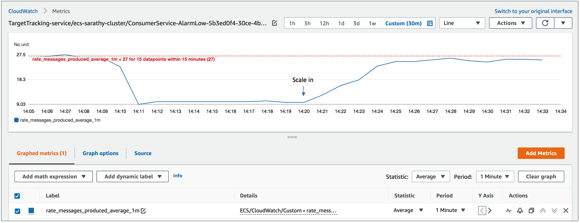 図 7. スケールインアクション中のターゲットメトリクス rate_messages_produced_average_1m の挙動