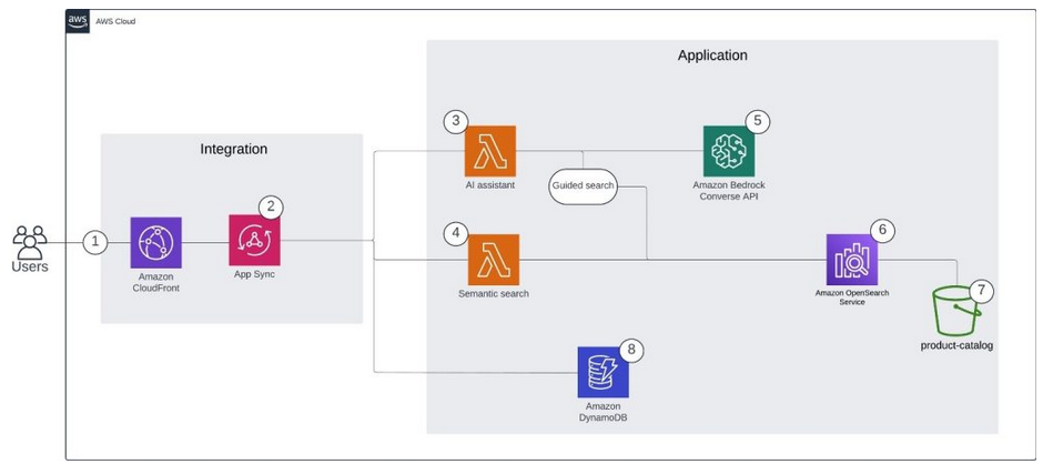 - ユーザーインタラクションとフロントエンドアクセス : 顧客は Amazon CloudFront でホストされているシームレスなウェブベースのインターフェースを通じて AI アシスタントにアクセスします。 認証が完了すると、顧客は商品を調べては質問をしたり、固有のニーズに合わせてカスタマイズされたガイダンスを受けたりできます。