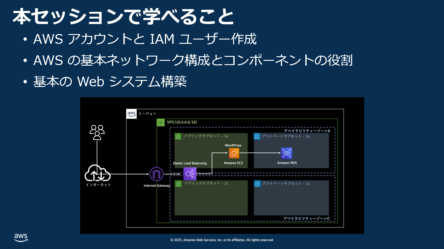 みなさまこんにちは!ソリューションアーキテクトの上野です。2023 年も早いもので残り数日ですね。年内中に何かをやりきろうとしている方、来年から本気出すと地固めをされている方、と状況は様々かと思いますが、そんなみなさまに年始のビッグイベントのご紹介です!2024 年 1 月 18 日に AWS Builders Online Series が開催されます。AWS Builders Online Series は、AWS の基礎を幅広く学ぶことができる、約 3.5 時間の初心者向けラーニングイベントです。今回は、AWS 基礎、モダンアプリケーション、SaaS といったカテゴリを中心に初心者向けの様々なセッションをご用意しております。このブログでは、AWS 基礎カテゴリの<2024 年度版>デモで理解する! 基本の Web システムアーキテクチャというセッションについて見どころをご紹介したいと思います。ご興味がある方はぜひ、本ブログ内にある申し込みリンクからご登録をいただけるとありがたいです。