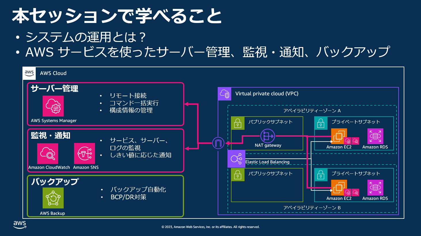 運用編では、基礎編、スケーラビリティ向上編で紹介される基本の Web システムアーキテクチャを題材に、システム運用とはそもそもどういったものか、どのような課題があるのかといった点からおさらいをして、システム運用を AWS サービスを使って効率化する方法についてご紹介をしています。デモパートでは、AWS Systems Manager、Amazon CloudWatch、AWS Backup を中心にご紹介をしており、各サービスが運用効率化に役立つことをイメージいただける内容になっております。運用といっても様々ですが、システム構築後、多くの方が直面する運用業務にフォーカスしておりますので、ぜひご覧いただければと思います。本セッションは以下のような方々に特におすすめとなっております。