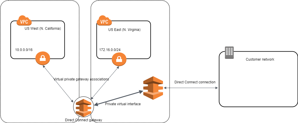 AWS Direct Connect Gateway は中国を除くAWSのすべてのリージョンにおいて、グローバル IP ルートを受信するパブリック仮想インターフェイスを作成することや、エンドポイントへのアクセスの有効化機能が提供されます。また、複数の AWS リージョンに渡り Virtual Private Cloud (VPC) で接続性を確立することができ、それぞれ複数の BGP セッションを確立する必要がないので、管理作業を減らしネットワークデバイスへの負担も軽減することができます。