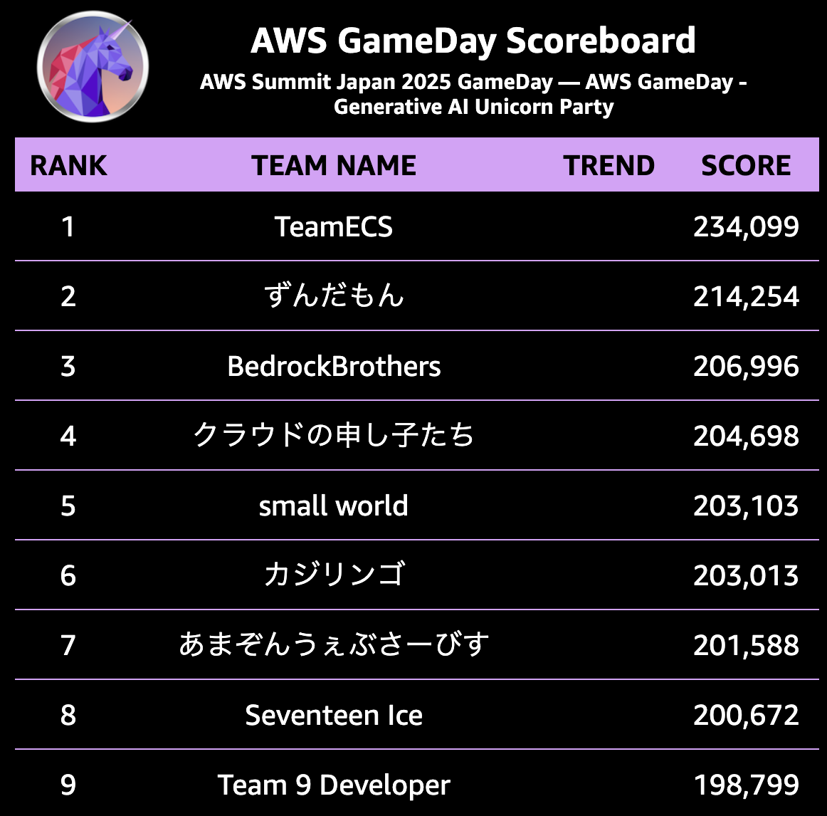 今回の GameDay では、Amazon Q Developer の力を借りながら問題に取り組むことができることもあって、多くのチームが問題を解けており、点数についてもかなり接戦であったように感じました。