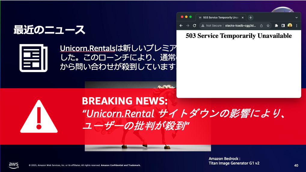 本 AWS GameDay for Telecom では、近年急増する DDoS 攻撃への対策をテーマに、参加者がチームを組んで架空の企業「ユニコーンレンタル株式会社」のインフラを守るという設定で、実践的なセキュリティ対策を題材としました。