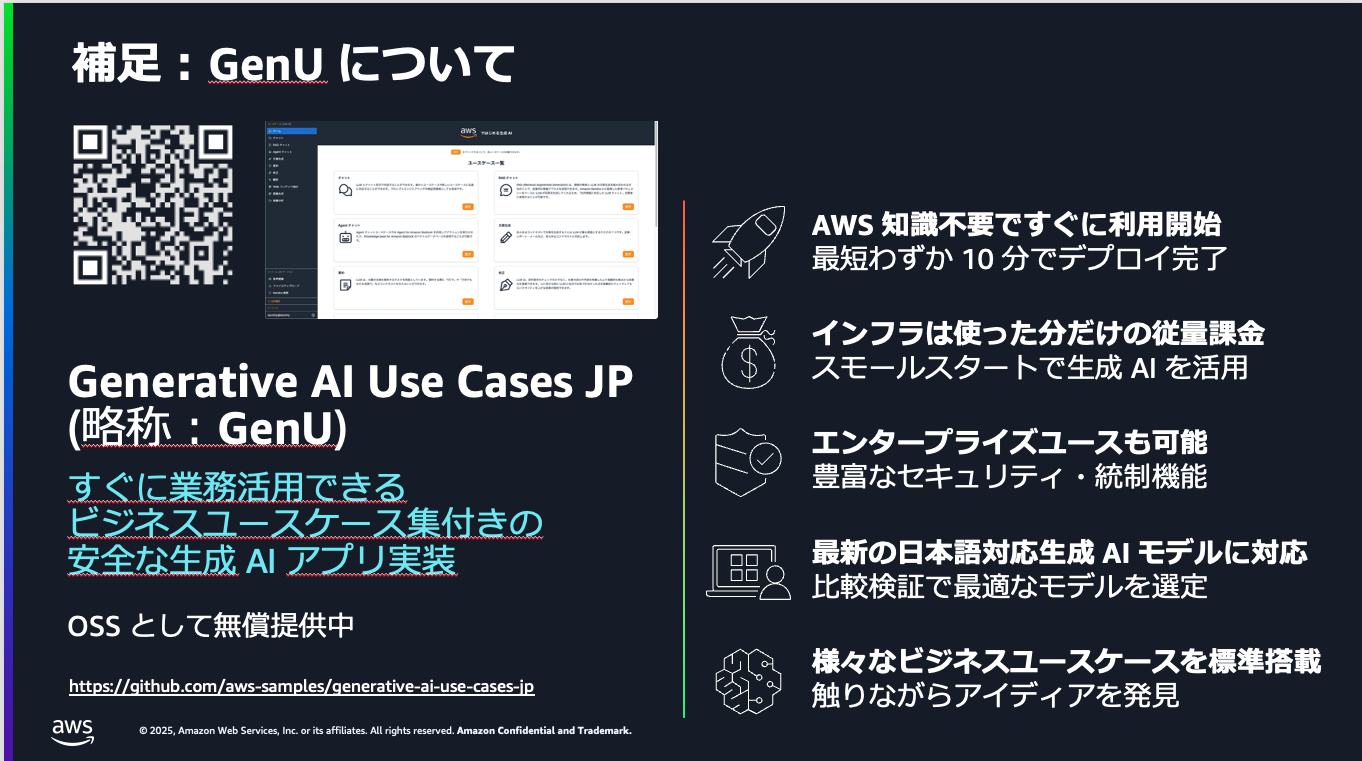 - Generative AI Use Cases JP(略称 GenU*、AWS 独自の生成AIツール)の活用による AI 支援型の補佐