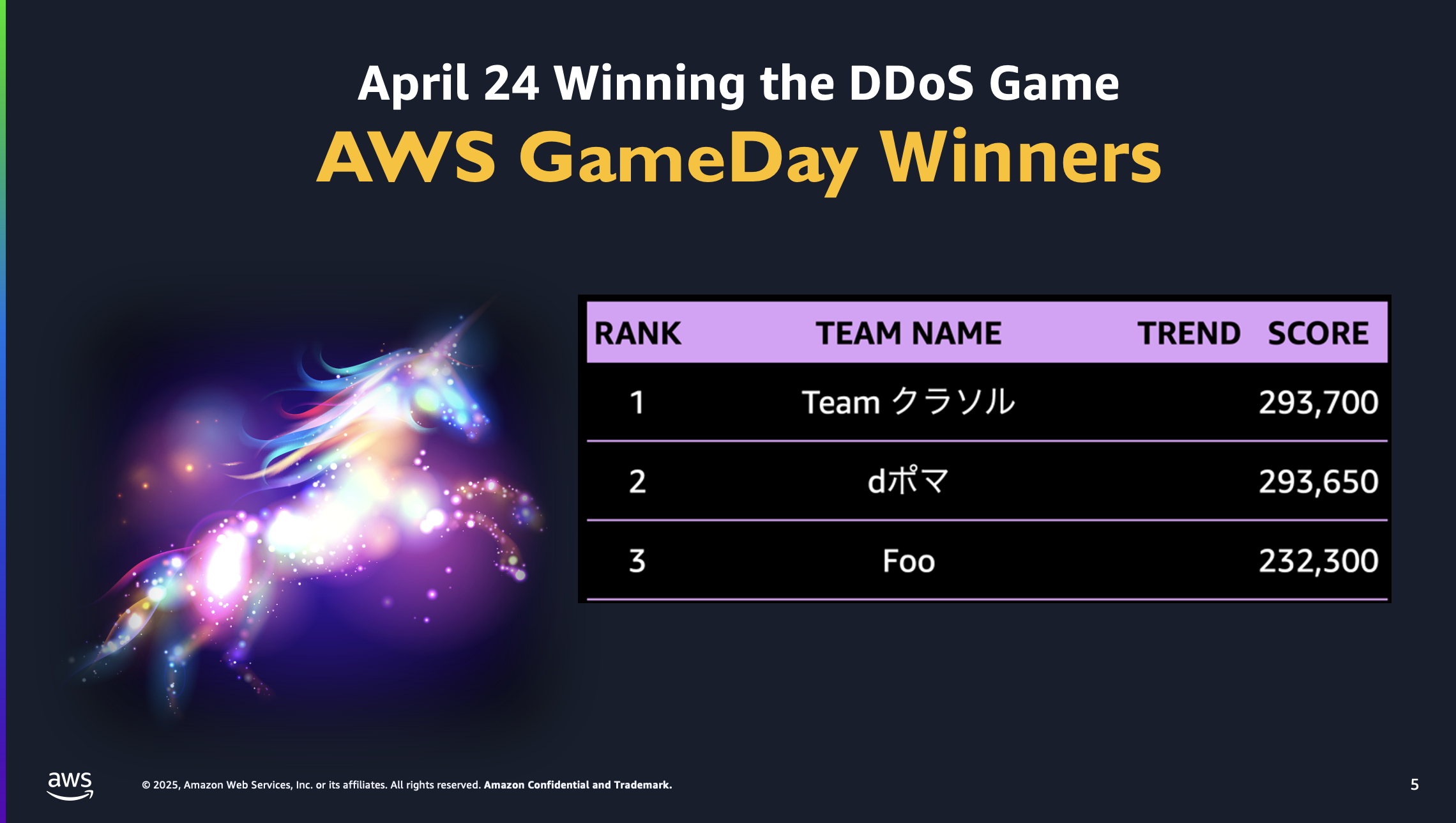 今回の AWS GameDay for Telecom: Winning the DDoS Game の結果ですが、1位と 2位のチームがわずか 50 ポイントという僅差で競り合う、最後の最後まで目が離せない白熱した展開となりました。上位 2 チームは 29 万ポイントを超える高得点を記録し、DDoS 攻撃への対応力の高さを示しました。3位チームも 23 万ポイントを獲得し、全体として参加チームが高い技術力を発揮した対抗戦だったと思います。