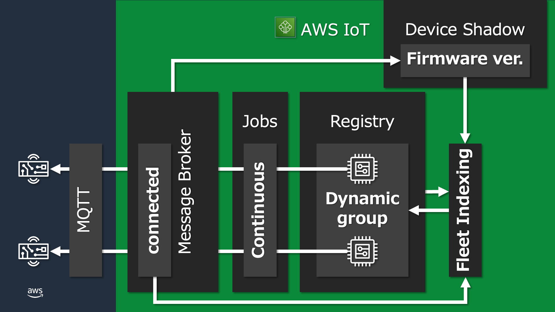 また動的グループとは、グループ作成時に AWS IoT に登録されたモノの検索条件を設定しておくことで、AWS IoT Device Management のフリートインデックスが条件に該当するモノを自動で検索し、モノのグループに動的に追加してくれる AWS IoT Device Management の 1 機能です。