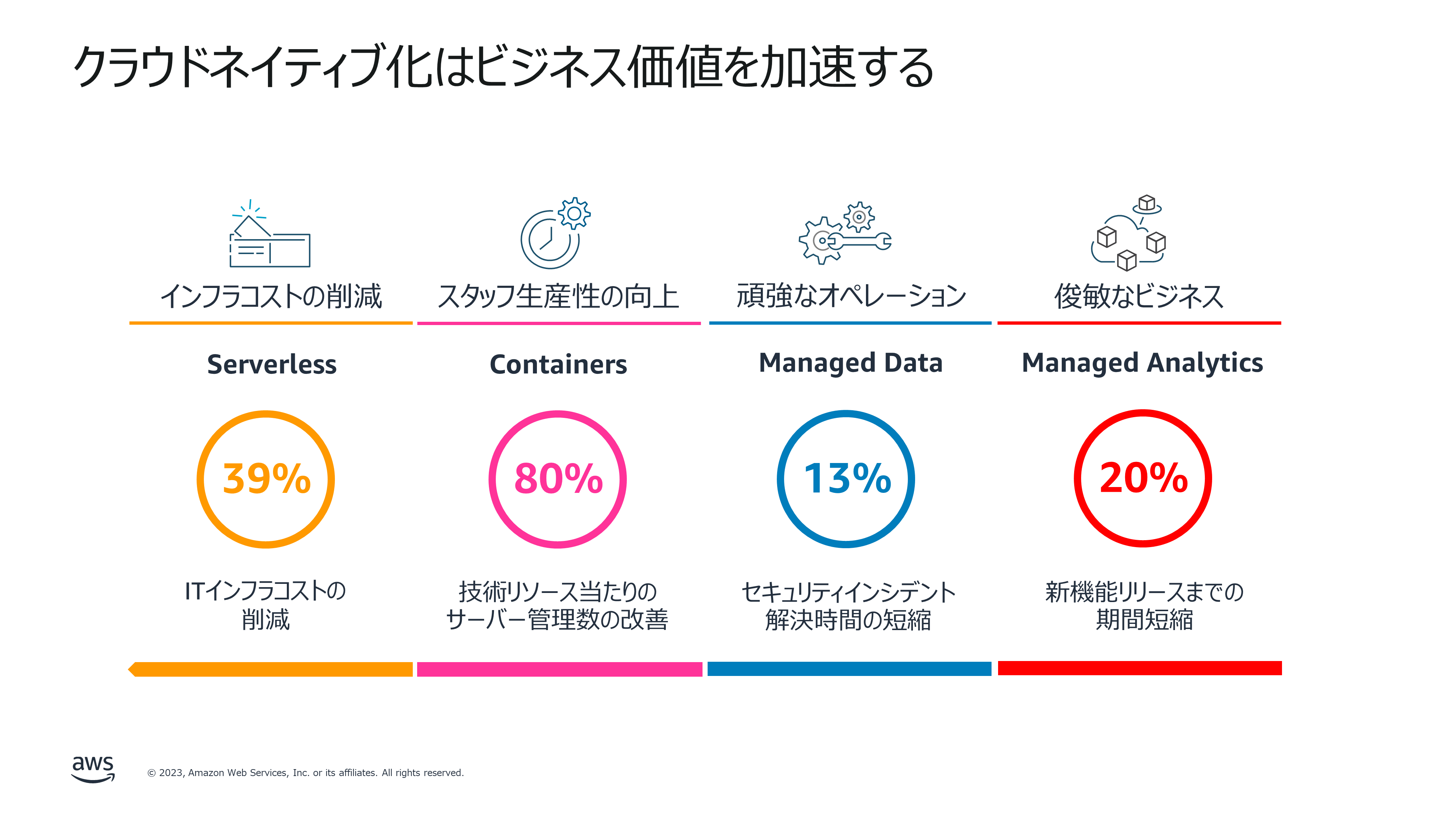 AWSが提案するクラウドネイティブ化は、モダナイゼーションとも呼ばれますが、既存の組織やシステムを段階的に変革し、「ビジネス俊敏性の最大化」や「イノベーションの加速」、「技術的負債の低減」を実現することを指します。アーキテクチャー面では、コンテナやマネージドDBの活用、サーバレスアーキテクチャへの再構築などをクラウドネイティブ化と定義しています。