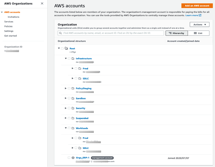図 1 に示すように、Organizations Unit (OU) の使用に関する AWS ガイドラインに従って、組織の OU 階層を構築しました。
