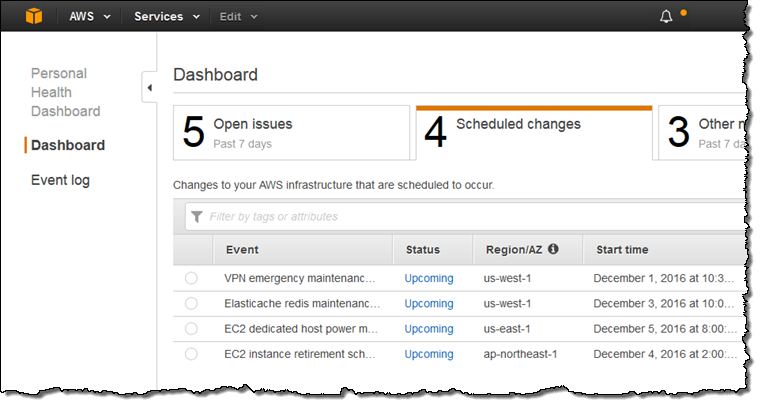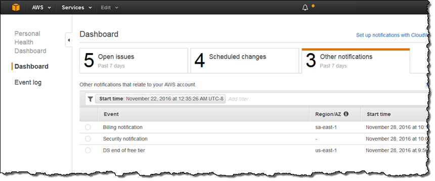 関心のあるサービスについてより多くの情報を提供できるよう、AWS Personal Health Dashboardをリリースしました。サービス名の通り、このダッシュボードは利用しているAWSサービスのパフォーマンス、可用性に関した個別のビューのみならず、サービスの状態に変化が会った際にはアラートを自動的に発行します。利用中のサービスに関して一元的に監視するためにデザインされており、影響を及ぼすであろう問題に関して、より詳細に可視化することが可能です。ダッシュボードに関係する情報が登録されると、コンソールから通知アイコンを確認出来ます。