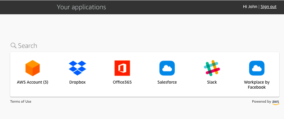 1. 企業内の認証情報を使って AWS SSO のユーザポータルにサインインします。もし、会社の AWS SSO ユーザポータルの URL を知らなければ、IT 管理者に聞いて下さい。URL は AWS SSO コンソールの Dashboard メニュー内にある “User portal URL” セクションに表示されています。ユーザポータルを開くと、アクセスが許可されている AWS アカウントが表示されます。