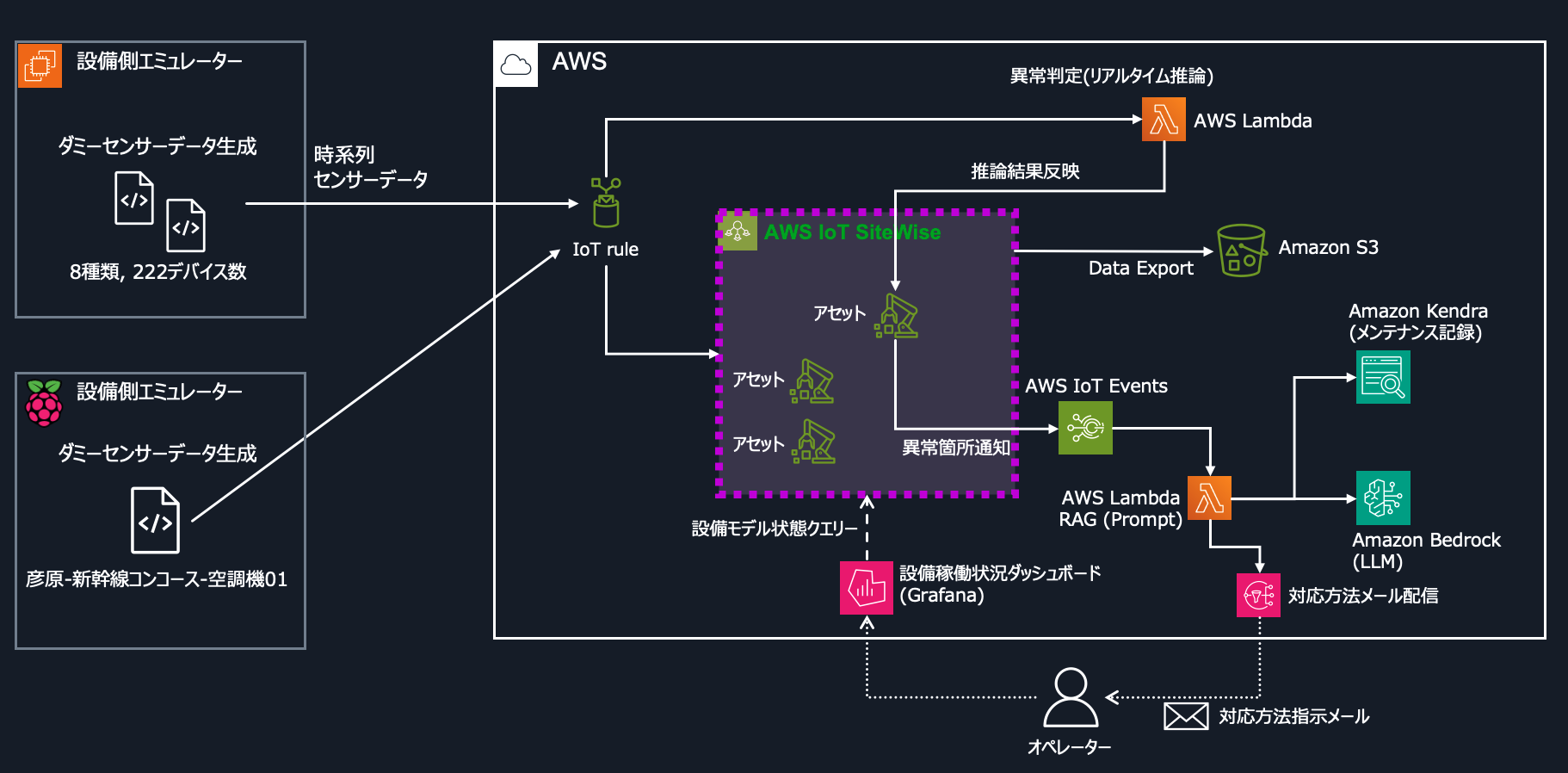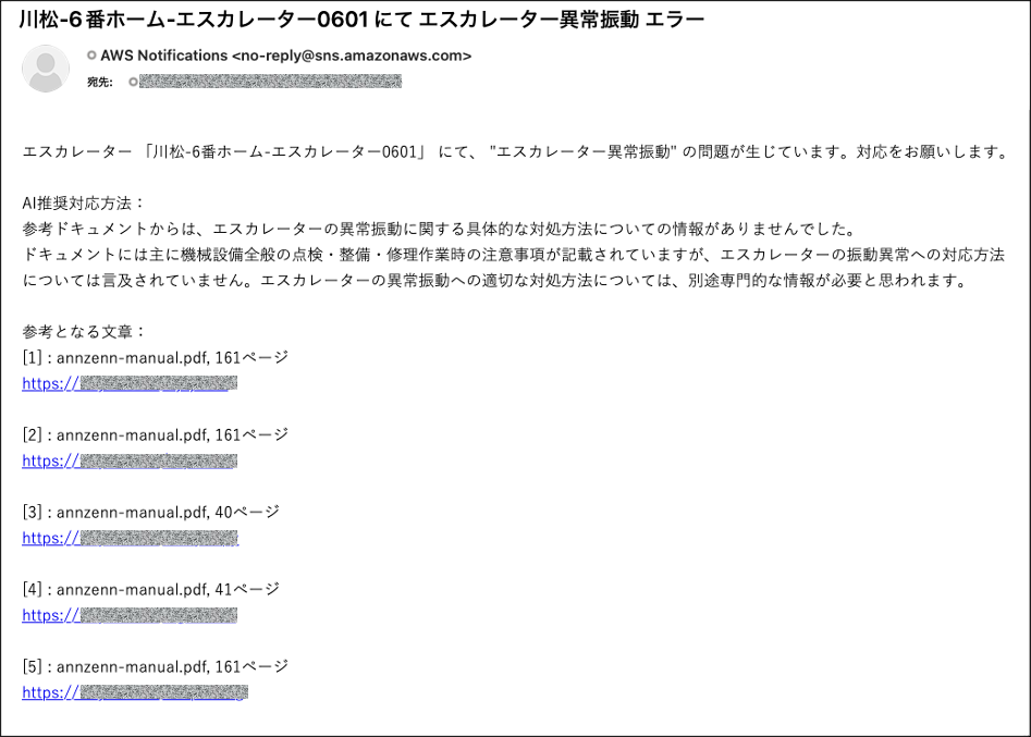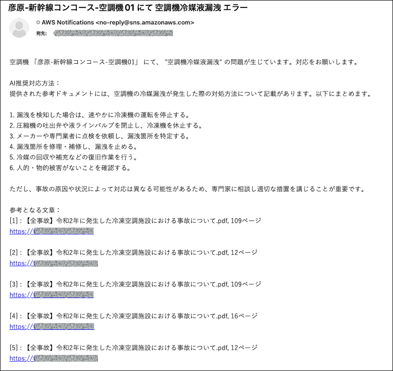 ダッシュボード上が異常となると同時に裏側では AWS IoT Events が動き RAG が実行されております。数十秒で RAG とメール送信の処理が完了し、アラート通知と過去の対応記録から類推された AI 推奨のエラー対応方法が記載されたメールを受信します。下図は実際にその時に受信したメール画面になります。