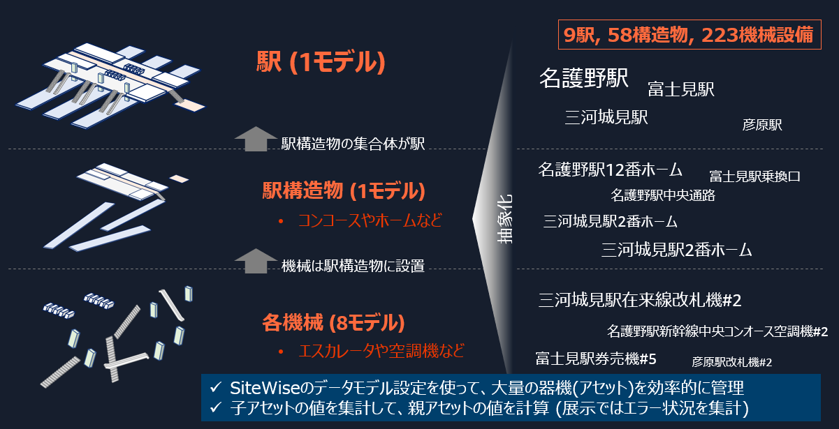 今回の展示では全線で9駅を対象とした設備監視システムを構築しました。58の駅構造物に分解されて、それぞれに延べ223の機会設備が配置されていることを想定しております。 AWS IoT SiteWise で各機械設備のデータを取得し、取得したデータを Grafana で可視化しております。223もの機械設備の様々なセンサーデータをどのように管理すると効率的で高度な監視を実現出来るでしょうか。データモデルに着目して述べていきたいと思います。