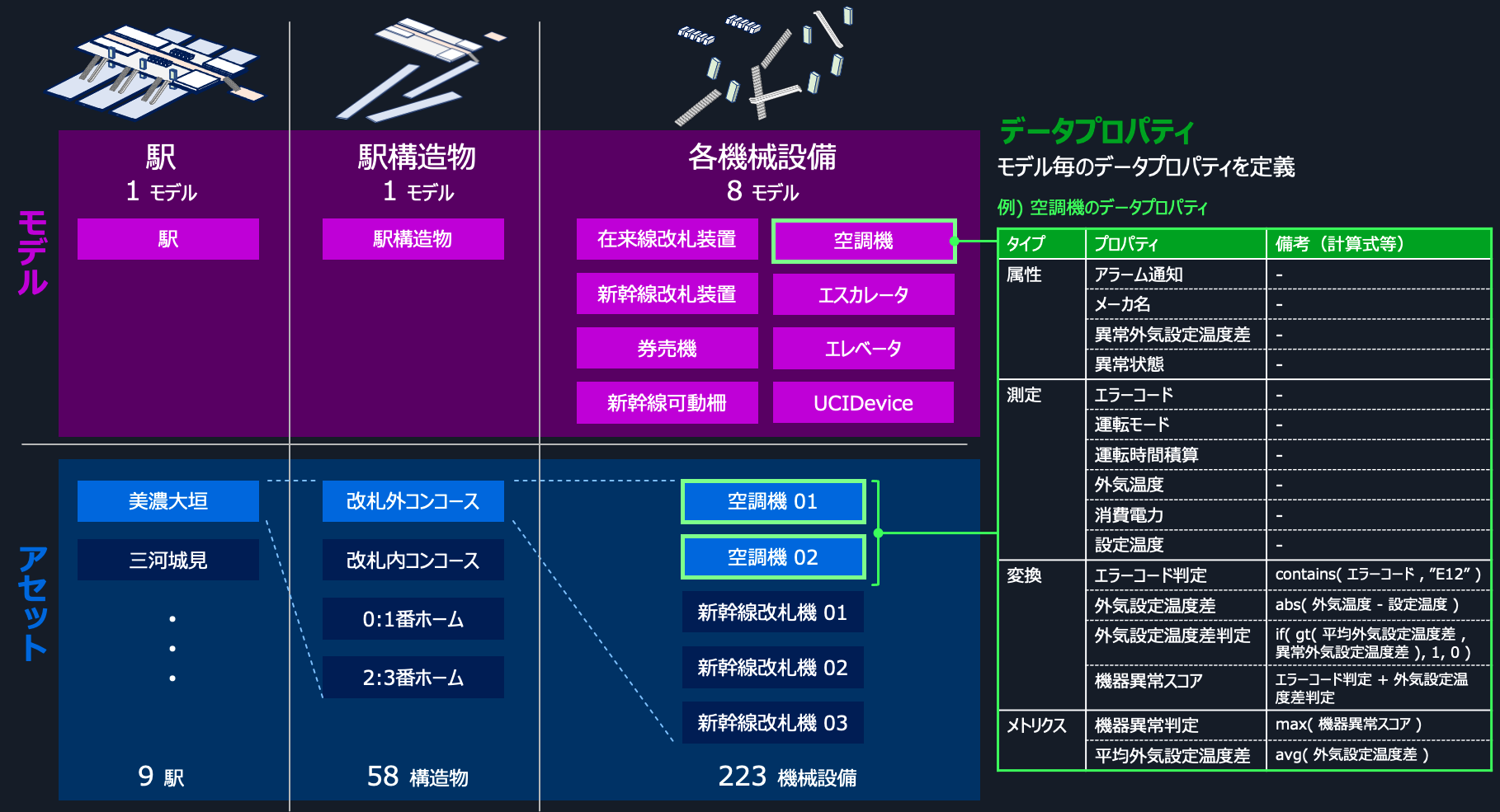 このように実際の駅の構成を抽象化し、アセットモデルとして定義することで、効率的に設備データを管理することができます。また、監視の要件に合わせて、取得したデータを評価・計算することにより難しい作り込みを必要とせずに簡単に高度な監視も実現することができます。