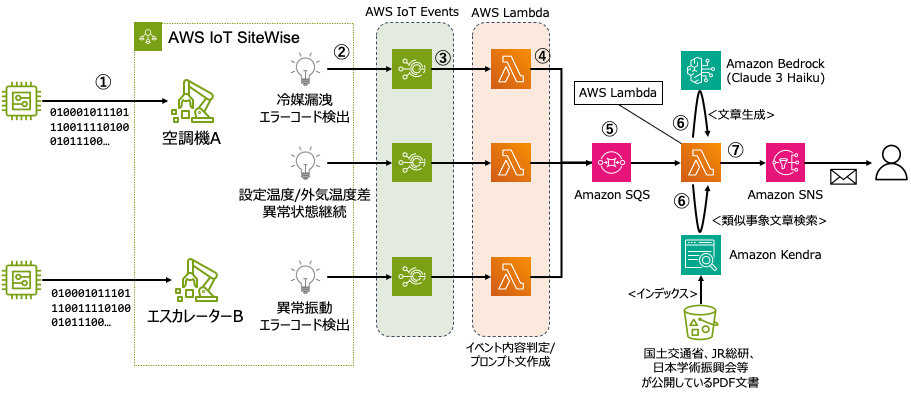 - Amazon SQS から渡されたエラー情報を元に AWS Lambda で RAG を実行します。RAG とは関連情報の検索を行い抜粋された文章を元に生成 AI が文章を作成する仕組みです。ここでは例えば、エラーコードから空調機の冷媒液の漏洩が発生という情報が Amazon SQS から渡され、「空調機の冷媒液漏洩発生時の対処方法」という文言で関連文章内を検索します。そして検索に引っかかった文章を元に LLM (Large Language Model) に「空調機の冷媒液漏洩発生時の対処方法を教えてください」と問いかけることで AI 推奨の対処方法を生成します。ちなみに今回の展示の RAG で使った LLM は Amazon Bedrock の Claude 3 Haiku で、ドキュメント検索のインデックス DB には Amazon Kendra を使いデータソースは Amazon S3 になります。Amazon S3 に格納されているドキュメントは国土交通省、 JR 総研、日本学術振興会などが公開している PDF 文章です。Claude 3 Haiku を選んだ背景としては、リアルタイムの異常時対応という想定のため、日本語の精度が高い Claude 3 の中でも一番レスポンスが早いということで選択しました。