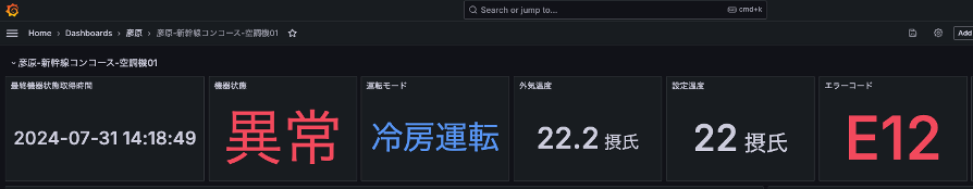 当日の展示では、意図的に故障データを流せる RaspberryPI (「彦原-新幹線コンコース-空調機 01 」を模擬) を用意し、そこでスクリプトを実行すると異常データが飛ぶという仕掛けを用意しました。実際に実行すると、 Grafana ダッシュボードはほぼリアルタイムで反映され異常となります。