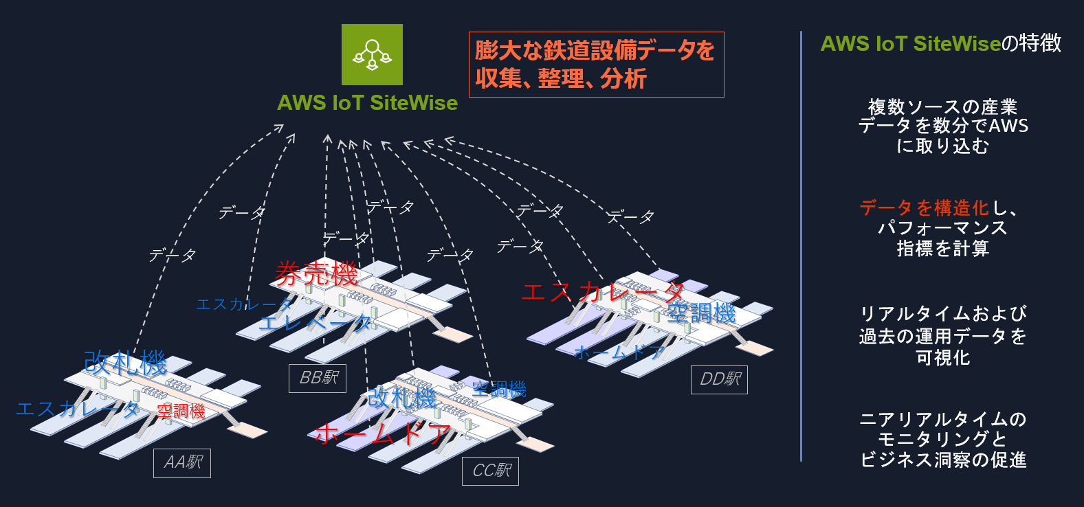 鉄道保全の現場では、転轍機や融雪装置などの従来の鉄道機械に加えて、ホームドアやエレベーターなど様々な機械設備があります。それらの設備は路線全体に点在しており、地理的にも広大な範囲に及びます。また、日本においては生産年齢人口が減少傾向にあり、保全業務の担い手確保が難しくなってくることが予想されます。これらを背景として、鉄道保全業務の効率化・高度化の必然性は高まってきております。効率化・高度化の一つの方向性として膨大な鉄道設備データを収集しリモートで集中管理することが有効です。 AWS IoT SiteWise を利用して路線全体に広域に配置されている鉄道設備群の大規模なデータを効率的に管理・モニタリングする方法についてご紹介いたします。