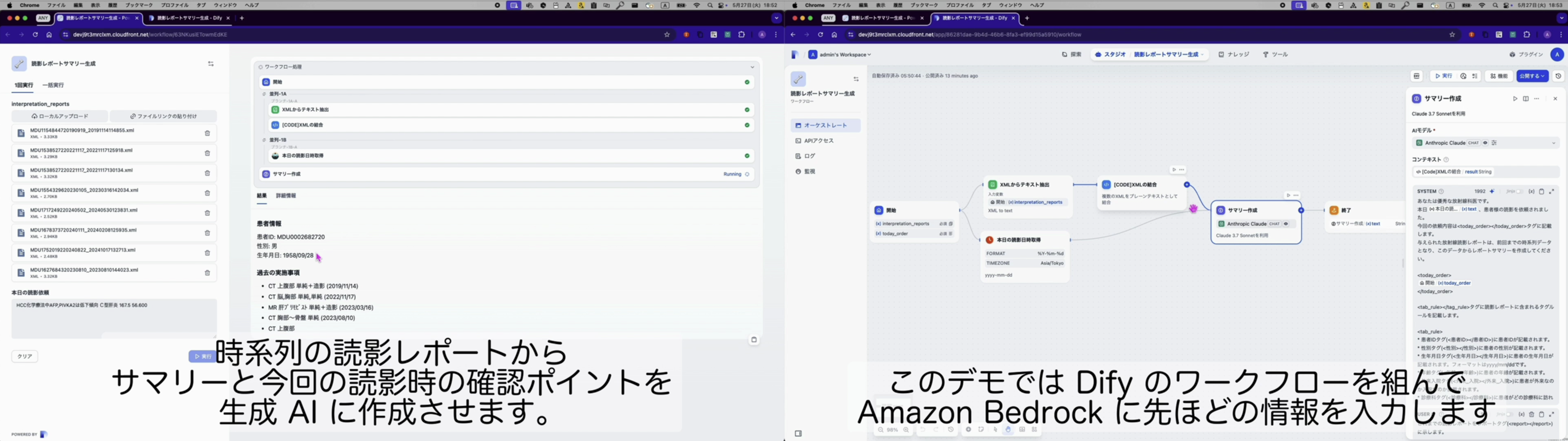 医師が読影を行う際、その患者の過去の読影レポートの記録から今回確認すべきポイントを整理するのに時間がかかっており、生成 AI によるサマリーが行えるか検証しています。患者の読影レポート一週間分を入力とし、生成 AI にて読影レポートのサマリーを生成します。患者の情報、過去の実施事項、これまでの所見時確認ポイント、診断履歴、今回の所見時確認ポイントを過去データに基づいてレコメンドするよう、生成 AI に対して、プロンプトにて指示を与えています。デモ環境には Dify を使っており、容易に検証が行える環境となっています。