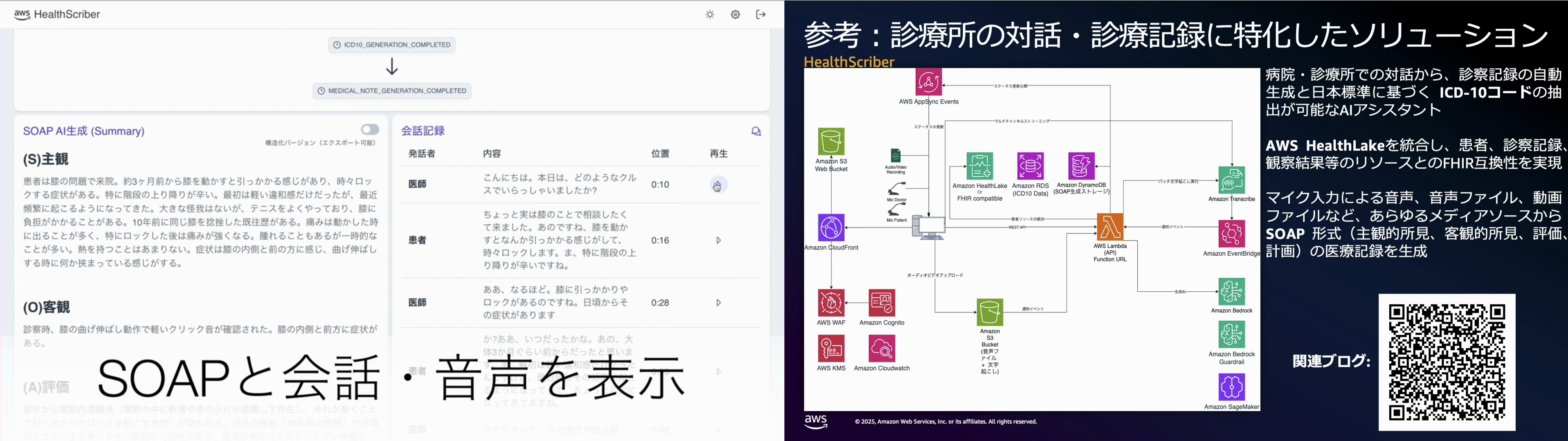 医師は患者を診察した後、電子カルテに診療録を記載するのに多くの時間がかかっており、診察時の音声から生成 AI を使って診療録のドラフトが作成できないかを検証しています。音声から Amazon Transcribe による文字起こしを実施し、SOAP (Subject、Object、Assessment、Plan) 文章を生成するデモアプリケーションを開発しました。医師と患者のマイクを別々に設定することができ、医師と患者の会話をリアルタイムに分離、文字起こしすることができます。医師、患者の分離を最初から行うことができるため、会話の途中でも、SOAP 文章やフォローアップ文章を生成することができます。また、完成した SOAP 文章から、候補となる ICD10 コード ( WHOが定義した国際疾病分類コード ) をリストアップすることができます。こちらは、予め Amazon Aurora に登録された ICD10 データに対してベクトル検索を実施しています。更に AWS HealthLake と統合し、患者、診察記録、観察結果等のリソースを HL7 FHIR 形式 ( 医療情報の交換を効率的に行うための国際標準規格 ) にて保存することができます。