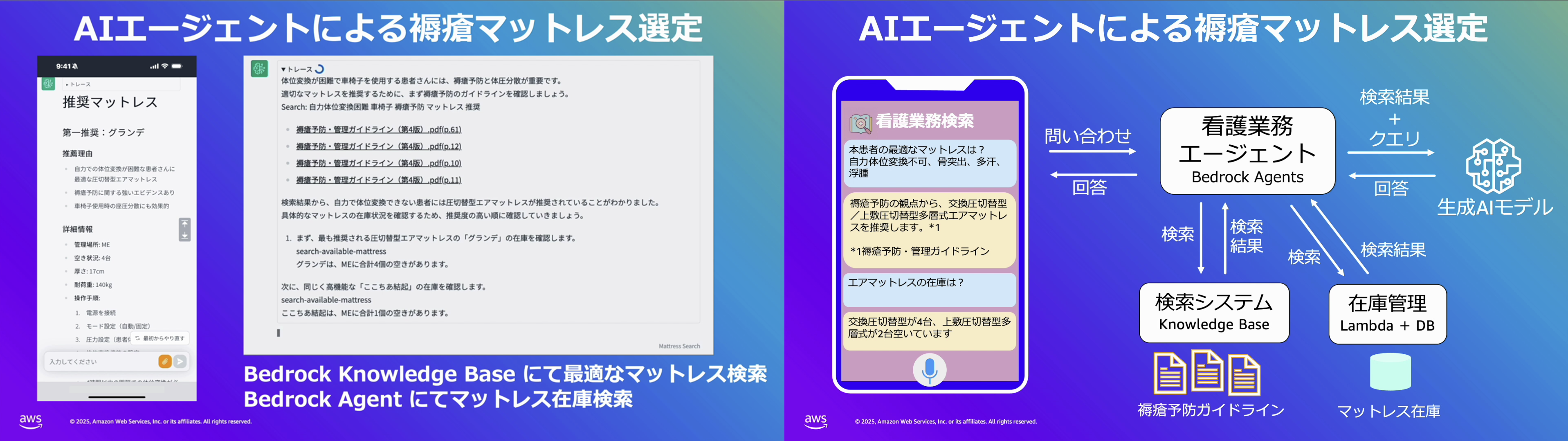 看護師は日々の患者の状態を確認し、最適な入院ベッドの選定に多くの時間を費やしています。本業務を改善するために、患者の状態を入力すると、褥瘡ガイドラインを用いて症状に応じた最適なマットレスの種類を検索、またそのマットレスの病院内空き状況を確認した上で、推奨マットレスを回答するエージェントを開発しました。Amazon Bedrock Knowledge Base を使い、褥瘡ガイドラインに対してベクトル検索を実施、デモ用にベッド空き状況を Amazon DynamoDB に保存し、検索用の AWS LambdaAmazon Bedrock Agent で呼び出しています。ユーザインターフェースには、Generative AI Use Cases (GenU) を利用しました。