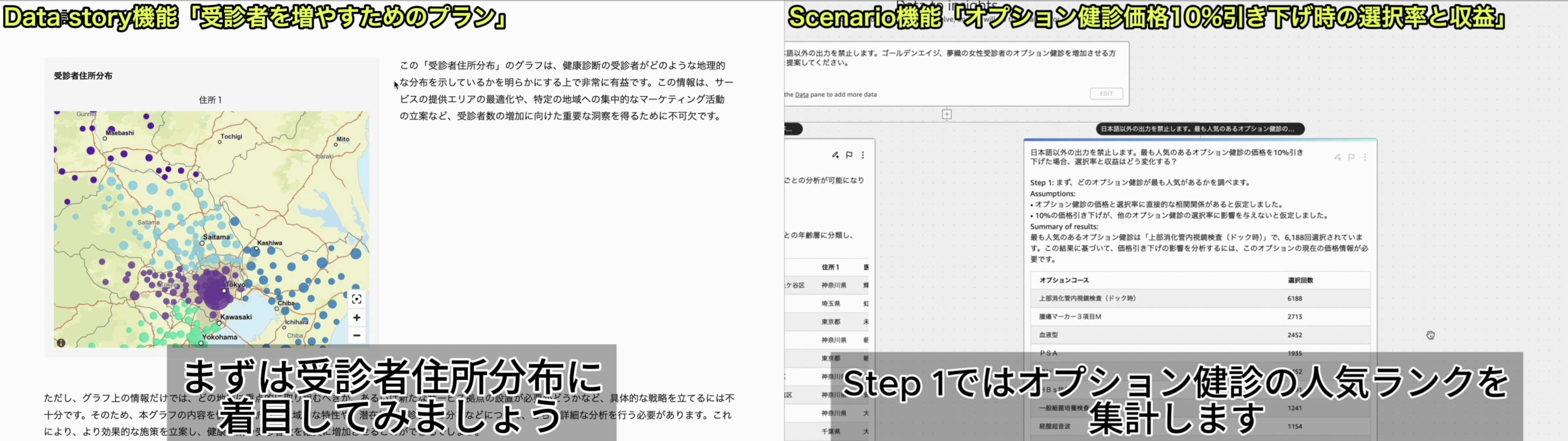 健診センターでは健診事業拡大へ向け様々なデータ分析を行っていますが、データ集計や可視化に多くの時間を費やしています。分析の効率を向上させるために、健診センターの実績ダッシュボードを Amazon QuickSight にて作成、そこから Amazon Q in QuickSight の 3 つの機能( データストーリー、データ Q&A 、シナリオ ) を使い、健診事業拡大へ向けた様々な戦略検討を行っています。まずは、データーストーリーを使い、全体的な傾向を把握、そこから地域に着目し、データ Q&A を使って特定地域のオプション健診平均単価から、テコ入れすべき健保を割り出します。最後にシナリオを使い、テコ入れすべき施策の詳細分析を実施していきます。
