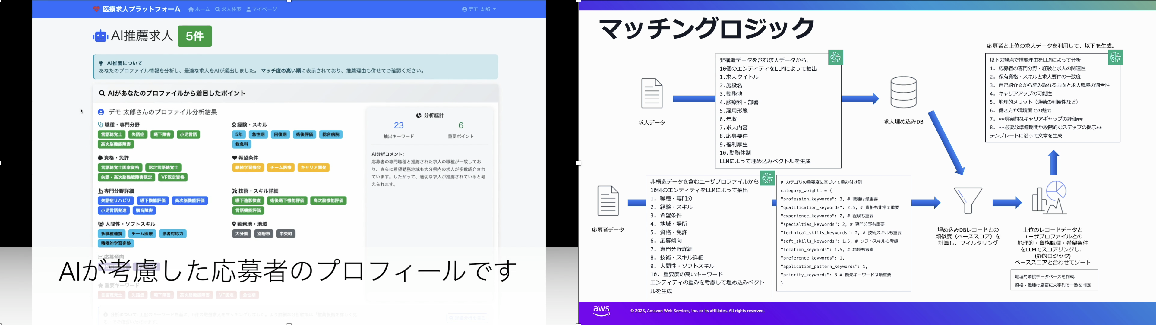 医療現場では求人と職員のミスマッチが大きな課題となっています。本課題への対策案の 1 つとして、医療系求人情報をベクトル化して保存、応募者のプロフィール情報を基に精密なマッチングを行い、推薦求人をリストアップしてくれるデモアプリケーションを開発しました。非構造データを含む求人データは、10 個のエンティティを LLM により抽出、ベクトル化して保存しています。そして、応募者プロファイルから 10 個のエンティティを LLM により抽出、カテゴリごとの重み付け ( 例えば、職種、資格の優先度を上げる ) を実施した後、求人データとの類似度を計算し、スコアの高い順に推薦求人を表示します。アプリケーション開発には、Amazon Q Developer を使っています。