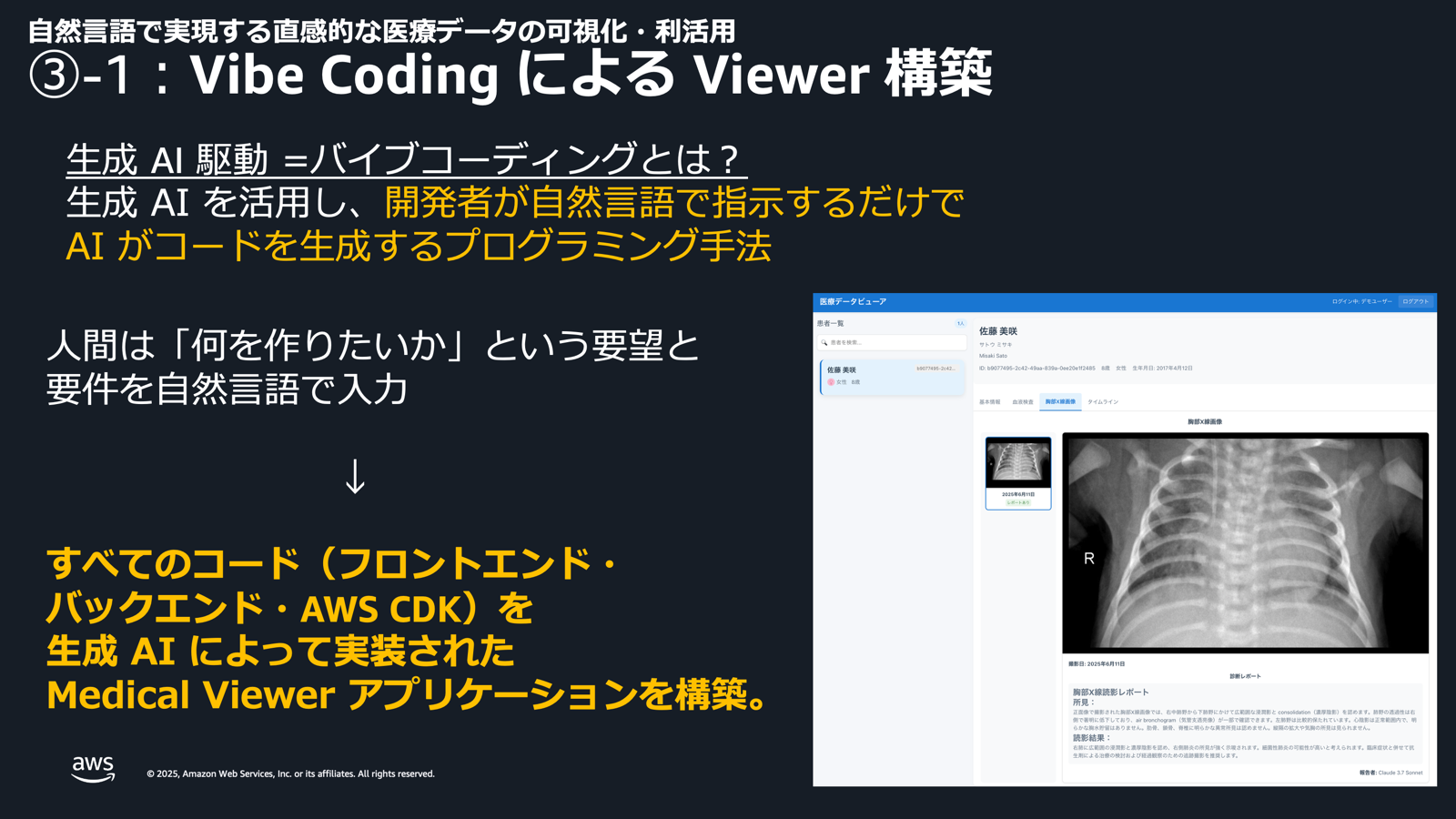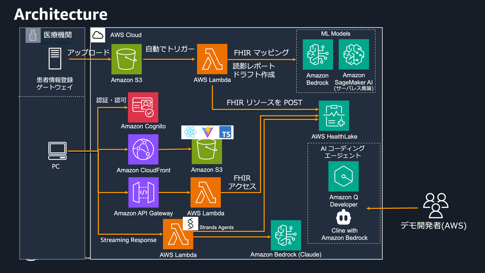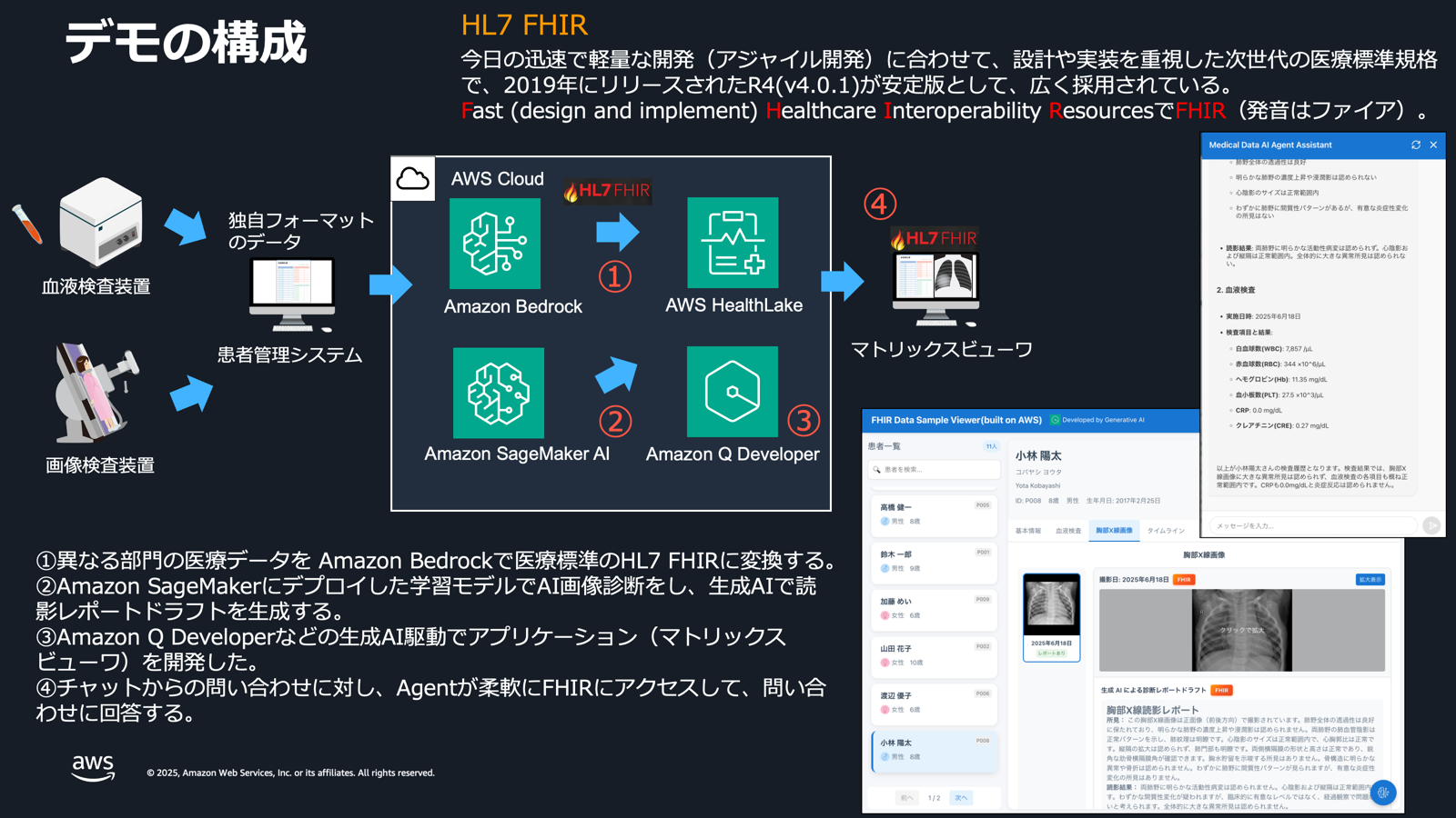 デモの構成は以下のような流れとなります。「血液検査装置」と「画像検査装置」で出力した検査結果を患者管理システムからクラウドの Amazon S3 に独自フォーマットのままデータをアップロードし、 Amazon Bedrock (LLMはClaude 3.7 Sonnet)でFHIRに変換をし、 FHIR Repository である AWS HealthLake に格納しています。 Amazon SageMaker AI にデプロイされた胸部X線画像の機械学習モデルで画像分類を行い、分類結果を数値で出力します。その項目毎の数値を胸部X線画像と共に再度、 Amazon Bedrock に元データとして渡し、読影レポートドラフトを作成し FHIR に変換し、 AWS HealthLake に格納します。患者情報、血液検査情報、画像検査情報、読影レポートドラフトはAWS HealthLakeに一元管理されます。 Amazon Q Developer などの AI コーディングエージェントを活用して自然言語で開発された、ブラウザベースのアプリケーションであるマトリックスビューワでは、それらFHIRによる医療データを検索、表示することができます。また、チャットによる対話で「XXさんの過去の検査履歴を表示してください」等の質問には血液検査と画像検査双方のデータに基づく回答が得られます。