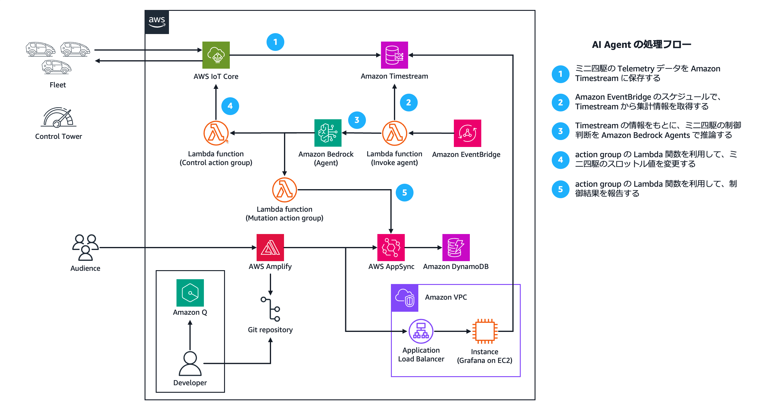 最も注目すべきは、クラウド上の AI エージェントによる自律制御機能です。ミニ四駆自体は判断を行わず、センサーデータを AWS IoT Core に送信し、クラウドからのスロットル制御指令を受け取るだけのシンプルな構成です。一方、クラウド側では Amazon Bedrock の AI エージェントが AWS Lambda 上で動作し、収集されたテレメトリデータを総合的に分析して状況を自律的に判断、最適な制御指令を AWS IoT Core 経由でミニ四駆に送信します。