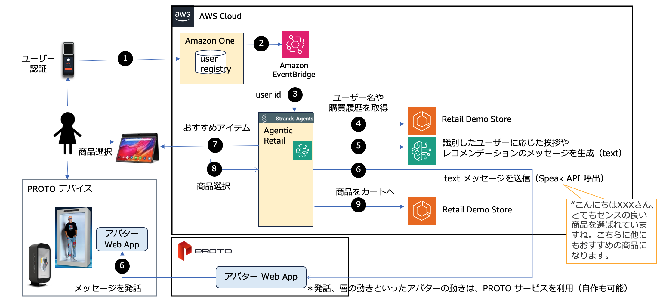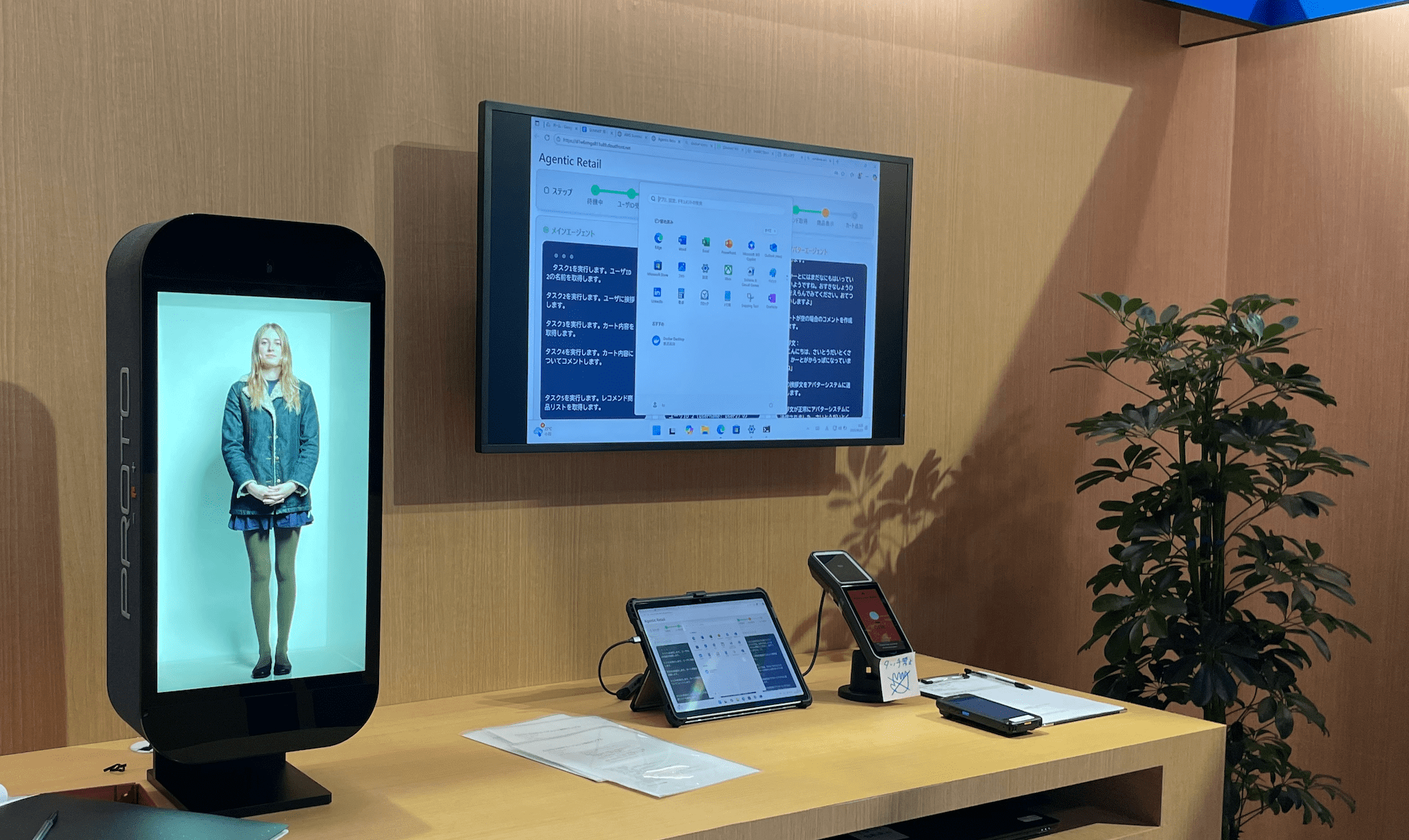 会場では 3D ホログラフィックディスプレイによる接客アバター(写真左)を展示し、AI エージェントと連携した少し先の未来へとつながる購買体験をお客様にご覧いただきました。お客様が Amazon One で認証を行うと、システムが顧客情報を取得し、AI エージェントが自動的に起動します。AI エージェントのプロセスについてはモニタリングされ(写真中央)、複数の AI エージェントが一貫した接客をどの様に行うのかを見ることができます。AI エージェントは取得した顧客情報をもとに、アバターへ会話内容を送信します。アバターはお客様の名前を優しく呼びかけながら、丁寧な挨拶で接客を開始します。さらに、AI エージェントが顧客の属性、購買履歴、カート情報を分析し、アバターがお客様へ最適化されたレコメンデーションを親しみやすい言葉で案内します。