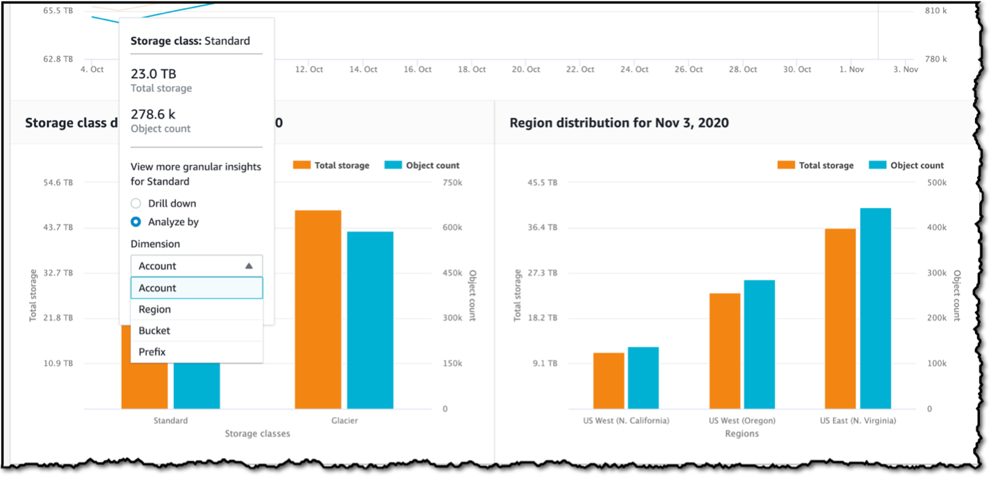 Amazon S3 Storage Lens は、オブジェクトストレージの使用状況やアクティビティの傾向を organization 全体で可視化し、コストを最適化してデータ保護のベストプラクティスを適用するための実行可能な推奨事項を提示します。S3 Storage Lens は、組織内の数百、数千ものアカウントにわたるオブジェクトストレージの使用状況とアクティビティを単一のビューで提供し、ドリルダウンして複数の集計レベルでインサイトを得ることができる初めてのクラウドストレージ分析ソリューションです。S3 Storage Lens を使用すると、そのバケット内のオブジェクトへのアクセスが頻繁ではない “コールド S3 バケット” を識別できます。図 4 に示すように、アカウント、リージョン、バケット、またはプレフィックスに基づいてフィルターを追加することで、詳細なインサイトを可視化できます。Amazon S3 Glacier や Amazon S3 オブジェクトライフサイクルポリシーなどの AWS ストレージサービスを活用することで、データアーカイブとライフサイクル管理を自動化し、時間の経過とともにストレージコストを削減することができます。