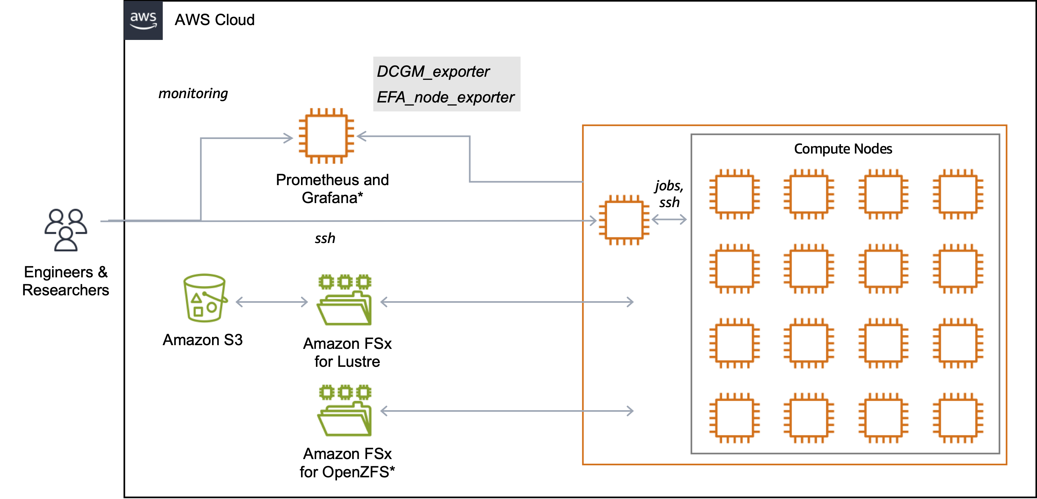 さらに、WWSOチームはParallelCluster( Machine Learning on AWS ParallelCluster)とHyperPod( Amazon SageMaker HyperPod Workshop)の双方に対応したワークショップを準備しました。これらの資料を使用して、参加者はSlurmを使用したトレーニングクラスターのデプロイ、FSx for LustreとFSx for OpenZFSを含むファイルシステム、マルチノードPyTorch分散トレーニングの実行を実践しました。ワークショップの別のセグメントでは可観測性とパフォーマンスチューニングに焦点を当て、参加者はリソース使用率、ネットワークスループット(EFAトラフィック)、システムの健全性のモニタリング方法を学びました。これらのセッションを通して、顧客とサポートするAWSエンジニアの両方が、共有の知識基盤とベストプラクティスのツールキットを確立しました。学んだすべての資産と知識を使用して、顧客はリードSAと共に、特定のユースケースに合わせたクラスターを同時にデプロイしました。このステップはオンボーディングセッションと呼ばれます。これらのセッション中、各リードSAは顧客がクラスターをデプロイし、NCCLテストを使用してクラスターの機能をテストし、通話中に発生した技術的な質問に対処できることを確認しました。