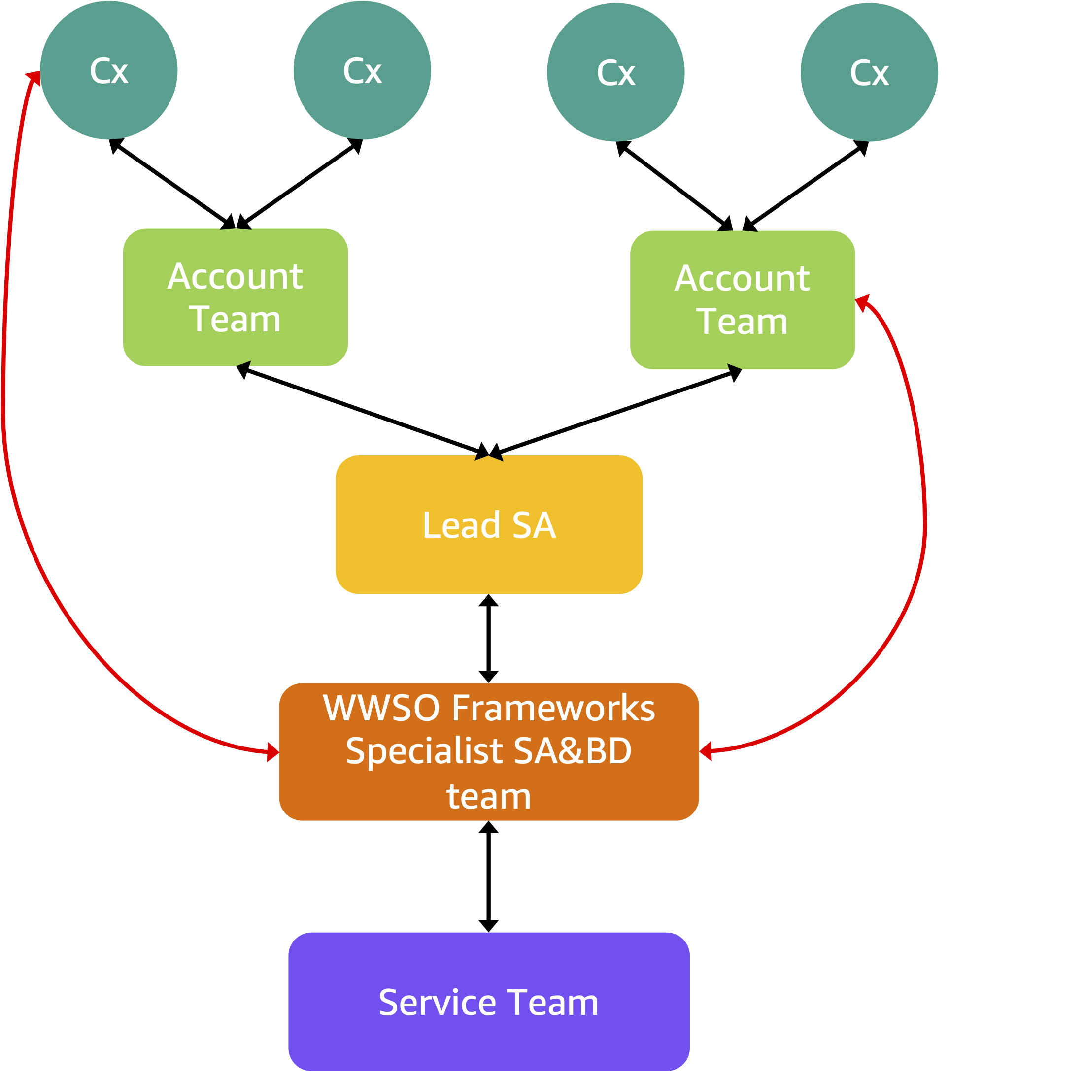 顧客(Cx)は通常、ビジネスリード、テクニカルリード、MLまたはプラットフォームエンジニアで構成され、トレーニングワークロードの実行を担当します。 AWS Account Team(ソリューションアーキテクトとアカウントマネージャー)は関係性の管理、ドキュメントの維持、顧客と内部スペシャリストとのコミュニケーションフローを確保します。 World Wide Specialist Organization(WWSO)Frameworksチームは、このエンゲージメント構造の確立と、プログラム内の技術的エンゲージメントの監督を担当します。彼らは他のステークホルダーとパートナーシップを組み、エンゲージメントをリードし、他のステークホルダーのためのエスカレーションポイントとして機能します。彼らは サービスチーム(Amazon EC2、Amazon S3やAmazon FSx for LustreなどのStorageサービス、Amazon SageMaker HyperPod)と直接連携し、エンゲージメント、エスカレーション(ビジネスおよび技術的)、エンゲージメントフレームワークの正常な動作を確保します。彼らは顧客にトレーニングと推論に関するガイダンスを提供し、他のチームに技術を教育します。WWSO Frameworksチームは GENIACに向けた支援体制で特に設定した役割であるリードソリューションアーキテクト(Lead SA)と密接に連携しました。これらのリードSAは、このエンゲージメントの基盤となる存在です。彼らはFrameworksスペシャリストチームと協力しながら、顧客とアカウントチームと直接連携します。彼らは顧客と直接対話しながら、詳細な技術的議論やトラブルシューティングの際には Frameworks チームの対応者と連携します。この階層構造により、AWSは複雑な基盤モデルトレーニングワークロードにわたって技術的ガイダンスを効果的にスケールさせることができます。