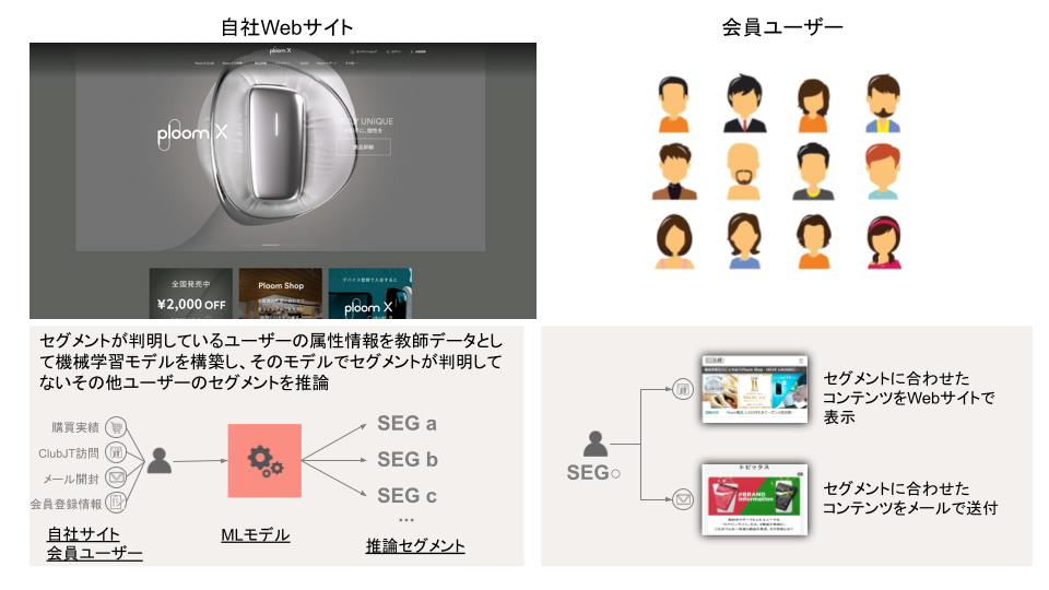今回ブレインパッドが開発を担当したプロジェクトでは、日本たばこ産業株式会社(以下、JT)が運営するWebサイトにおける会員ユーザの属性(購買実績など)を元にユーザをいくつかのセグメントに分類し、マーケティング施策に活かすことを目的としています。