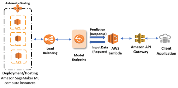 SageMaker は、推論サービスの可用性を高めるために、異なるアベイラビリティーゾーンにデプロイされる 1 つ以上のマネージド Amazon Elastic Compute (EC2) インスタンスで構成されるモデルエンドポイントを介してモデルをホストします。各 Amazon EC2 インスタンスには、各インスタンスが予測の応答を提供できるように、リクエストに応答するためのWebサーバーと、モデルのアーティファクトが含まれています。これらのインスタンスの状態は、リクエストを分散できるロードバランサーと、ピーク負荷時に新しいインスタンスを起動できる Auto Scaling によって維持されます。モデルエンドポイントは、estimator.deployを呼び出したときにSageMakerが特定のモデル用に作成するRESTful APIです。