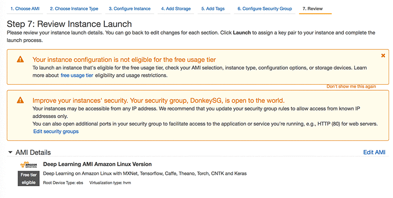 Build an Autonomous Vehicle on AWS and Race It at the re:Invent Robocar Rally 自動運転車は近い将来に車道を埋め尽くすことが見込まれています。ディープラーニングと自動運転のアプリケーションの進歩がこの自動運転車を実現しました。このポストでは、Amazon AI サービスを活用したリモートコントロール (RC) 自動車を製作する方法のチュートリアルを紹介していきます。 通常、各自動運転車には高度なテレメトリを提供する多くのセンサーが搭載されています。このテレメトリは、個々の自動車の運転と共に、ユーザーエクスペリエンスを向上するために使用できます。こういった向上の例には、スマートドライブルーチングによる時間の短縮、車両航続可能距離と効率の向上や安全性とクラッシュリポートの増大などがあります。AWS では、TuSimple などのカスタマーが Apache MXNet を使用した繊細な自動化プラットフォームを構築しました。最近では、TuSimple が 200 マイルドライバーレス運転を成功しました。 ディープラーニング、AWS IoT と人工知能 (AI) の技術による運転の認知を目的として、AWS はワークショップ形式のハッカソンである Robocar Rally を re:Invent 2017 で開催します。このポストは、開発者を対象に自動化 AI 技術を学習し、ハッカソンに備えるためのブログポストと Twitch ビデオシリーズの第 1 弾となります。ハッカソンについての詳細は、Robocar Rally 2017 をご覧ください。 このチュートリアルでは、Donkey という名称のオープンソースプラットフォームを活用します。希望する場合には、お手持ちの 10 分の 1 スケールの電気自動車で体験することもできます。ただし、Donkey プロジェクトで使用される 16 分の 1 スケールの RC カーの使用がより推奨されます。 次の 2 本のビデオでは、これから説明するチュートリアルを使用して AWS で製作した 2 台の自動車を紹介しています。 自動車ビルドプロセス 自動運転車の組立てと設定のプロセスは、このレポで説明しています。このレポには、素材の完全リストと個々のコンポーネントの購入場所を示すリンクも含まれています。主なコンポーネントは、RC カー、Raspberry Pi、Pi カメラと Adafruit Servo HAT となり、この合計額は 250 ドル以下です。ステレオカメラ、LIDAR データコレクタや加速度計などのさまざまな追加センサーを購入することもできます。 基本的なレベルの性能と工程を確実にすることで、未分化状態の運用負荷を最小限に抑えるために、この Github レポ の手順に従うことが推奨されます。 プラットフォームを完全に作動するためには、次の手順に従ってください。 自動車の組立て Raspberry Pi の設定 Amazon EC2 インスタンス上でパイロット (制御) サーバーをセットアップする 自動車のデフォルトモデルを実行する GitHub へのリンクのステップ 1 と 2 の説明に従うことをお勧めします。 AWS における Donkey サーバービルド Donkey ソリューションの主要な部分は、自動車とクラウド間のコミュニケーションを斡旋するパイロットサーバーの制御です。手動による制御とオートパイロットを切り替える「ため」の指示を行います。車は Pi カメラからのイメージを使用して移動します。また、イメージは Pi でローカルマシンに保存することも、検査や訓練用目的で EC2 インスタンスにストリームできます。 パイロットサーバーは、AWS ディープラーニング AMI 上に構築され、Docker コンテナとしてデプロイされます。これによって、高度なパフォーマンス、変更不可、そして AI が構築されるプラットフォームの簡単な操作が可能になります。 まず初めに、AWS マネジメントコンソールにログインし、近接するリージョンの EC2 をサービスのリストから選択します。このブログポストでは、US-EAST-1 を選択します。 ステップ 1: Amazon Machine Image (AMI) の選択 AWS Marketplace で 「Deep Learning AMI Amazon Ubuntu」を検索して、選択を選びます。 ステップ 2: インスタンスタイプを選択する EC2 インスタンサイズとタイプを選択します。このブログポストでは、GPU が最適化されている G2.2xlarge を使用します。G2.2xlarge インスタンスタイプは、人気が高い 7 つのディープラーニングフレームワーク (MXNet、Caffe、Caffe2、TensorFlow、Theano、Torch、CNTK) をサポートするビルトインを提供します。より低価な EC2 インスタンスでも、使用が成功する場合があります。 ステップ 3: インスタンスの詳細を設定する すべてをデフォルト状態のままにし、インターネットを介して接続される自動運転車からのインバウンド通信が許可される適切なパブリックサブネットを使用していることを確認してください。 ステップ 4: ストレージを追加する このソリューションは大きな容量を必要としないため、32 GB 凡庸 GP2 ボリュームで十分です。 ステップ 5: タグの追加 タグを追加することは、リソースの使用度を追跡できる観点から、常に推奨されます。 ステップ 6: セキュリティグループを設定する Donkey サーバーには、TCP ポート 8885-8888 が自動運転車に属