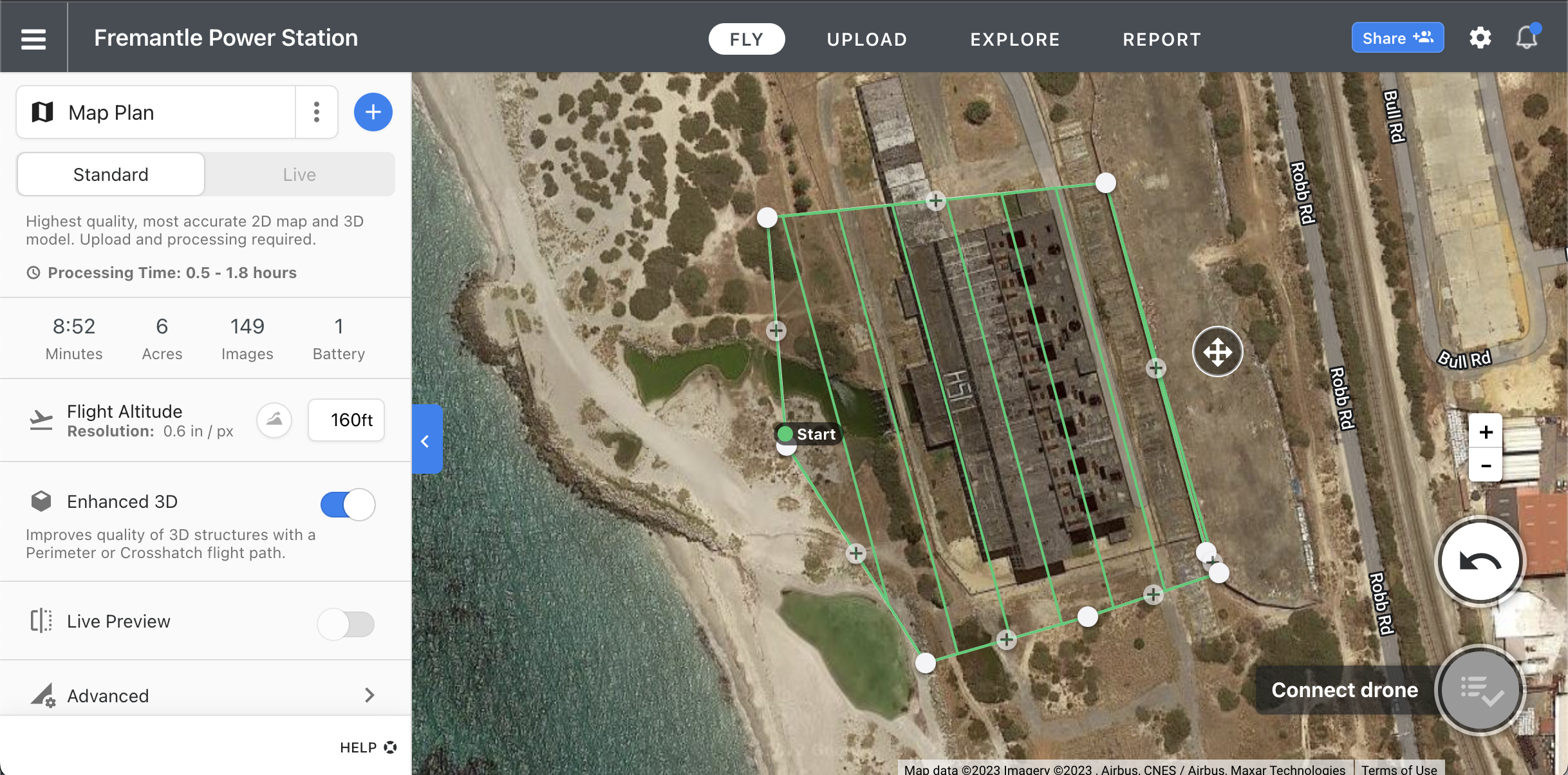 熟練したドローンパイロットが手動で撮影して写真測量を行うことも可能ですが、飛行と撮影を自動化することで、より一貫した結果を得ることができます。飛行計画ツールを使えば、適切な場所、高度、重なり具合の画像を撮影する自律飛行計画を作成して、効果的な写真測量処理を行うことができます。図 1 に示すのは、この記事の画像撮影に使用した、屋内外の視覚データ用の人気のリアリティキャプチャプラットフォームである DroneDeploy の飛行計画作成画面です。