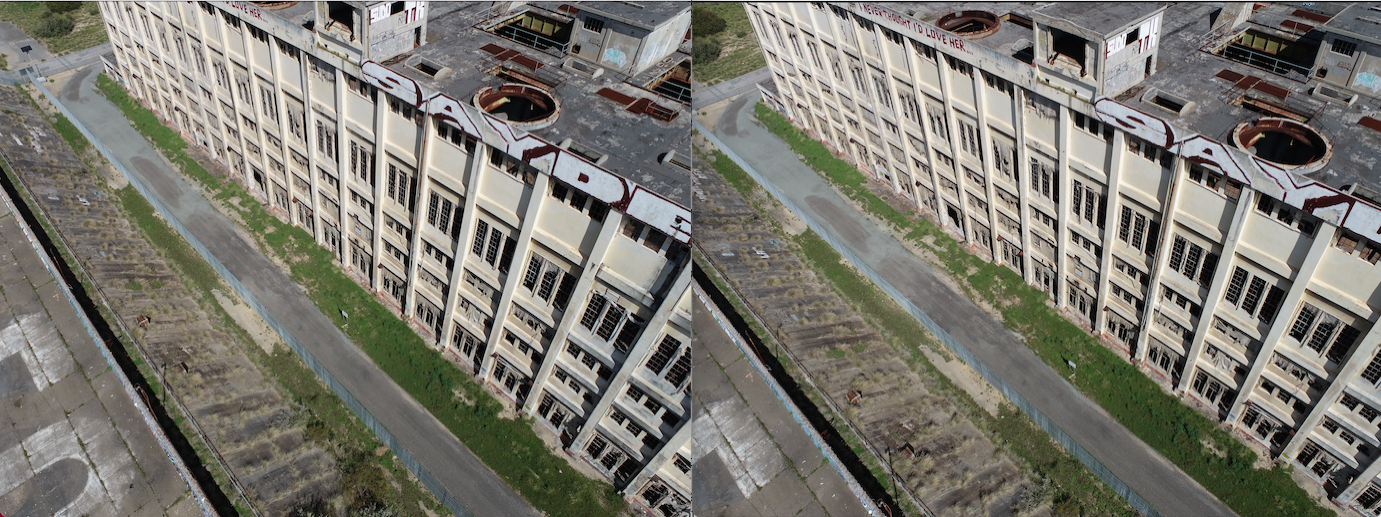 DroneDeploy プラットフォームの飛行計画機能と自律運用機能を使用して、AWS IoT TwinMaker でモデル化するアセットを表すデータを撮影しました。対象のアセットは、西オーストラリア州フリーマントルにある廃墟となった発電所です。前のスクリーンショットに示されているように、ドローンは 160 フィートの高さで飛行し、9 分足らずで 6 エーカーのエリアをカバーし、149 枚の画像を撮影しました。図 2 に、ドローンで撮影し、3Dモデル生成に使用した航空写真の例を 2 つ示します。ご覧の通り、画像間の重複度が高いことがわかります。
